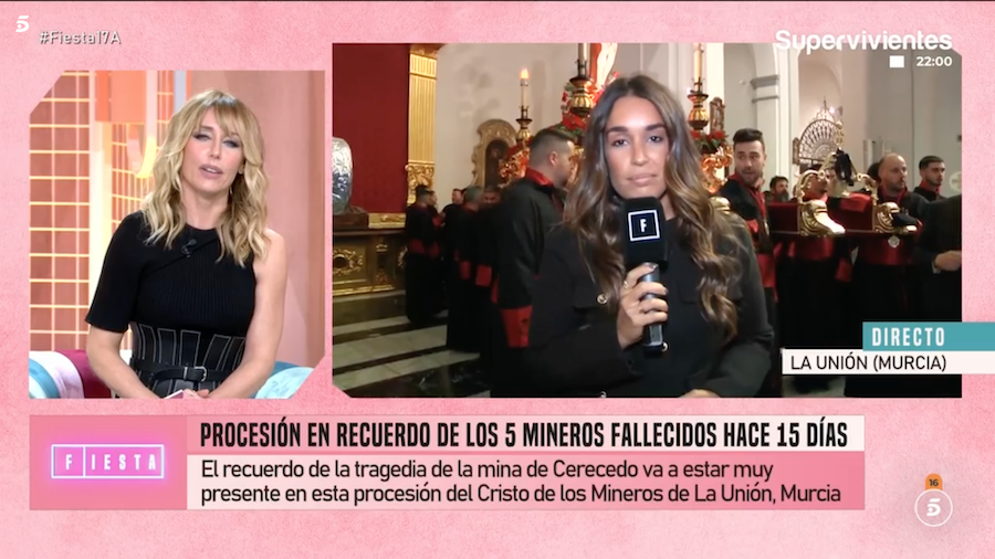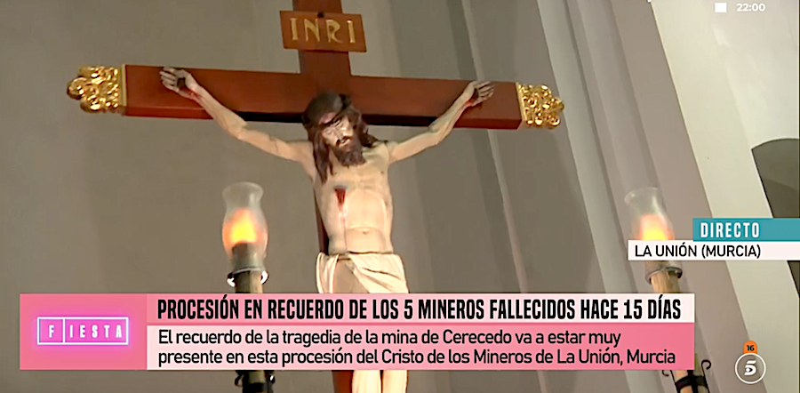 Ha sido el programa 'Fiesta' de la televisión privada nacional el que ha conectado con el templo, habiendo durado unos dos minutos la conexión, tiempo en el que hay que destacar tres aspectos. Uno es la solidaridad de esta tierra minera con los mineros asturianos. Otro es que la procesión, que aspira a conseguir el sello de 'Interés Turístico Nacional', ha plasmado bien su singularidad, que es la presencia de elementos de la etapa minera de La Unión. Y el tercer aspecto a resaltar es la proyección exterior que supone para el municipio aparecer en un programa de cobertura nacional con buena audiencia. La procesión ha comenzado a las nueve de la noche.