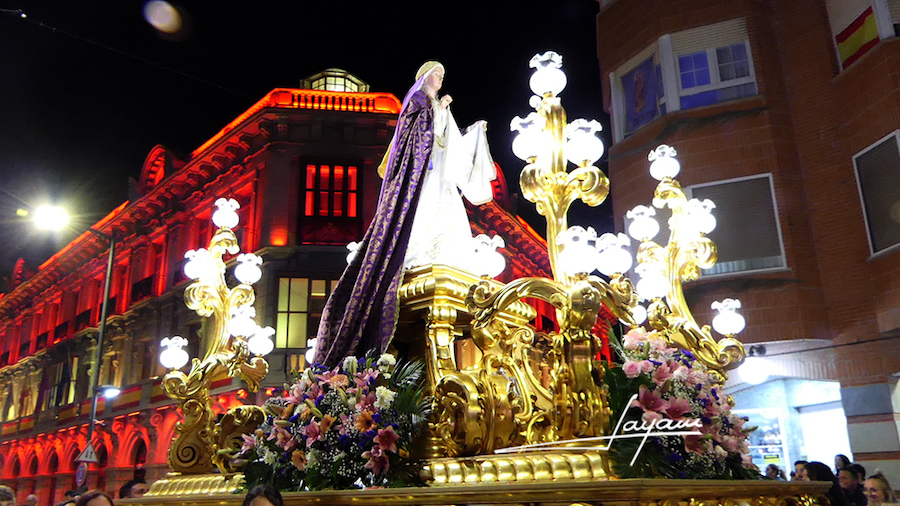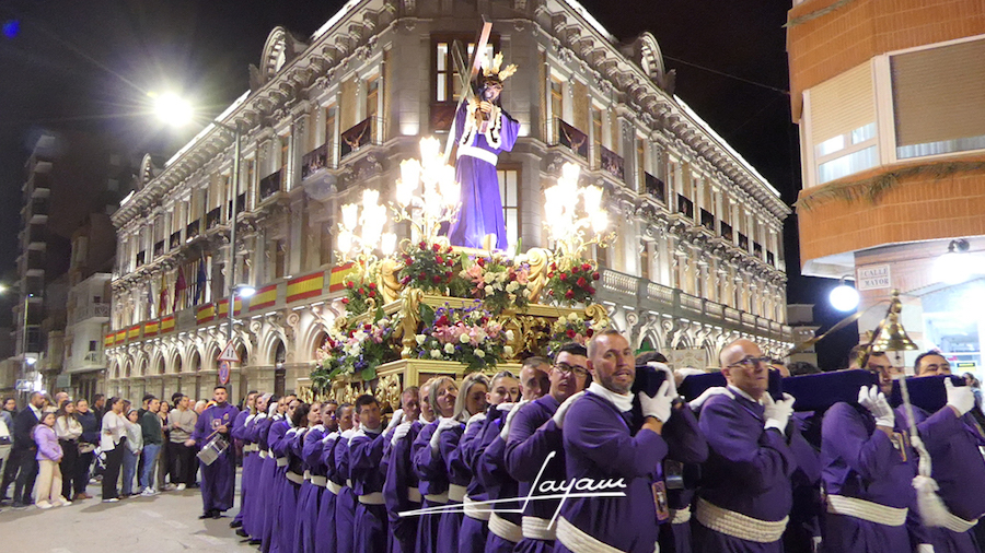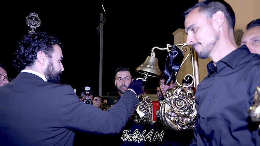 Un hecho a destacar es la paridad de este cortejo, pues son tres los tronos con portapasos mixtos (Nazareno, Dolorosa y Virgen de la Caridad), lo que es otra seña de identidad de nuestra semana de pasión y muerte de Cristo. En el primero de ellos, que abría la comitiva, nos llamó la atención de que iban más damas que caballeros portapasos. Al parecer, es la primera vez que sucede dentro de unas cifras bastante equilibradas y de que la presencia femenina es cada vez mayor. Es más, no me atrevería a decir si anoche fueron más ellas que ellos los que dieron forma a la procesión. Por cierto, en este paso era novedad la presencia de Ana Pérez como presidenta de la agrupación de Jesús portando la cruz hacia el monte del Calvario.