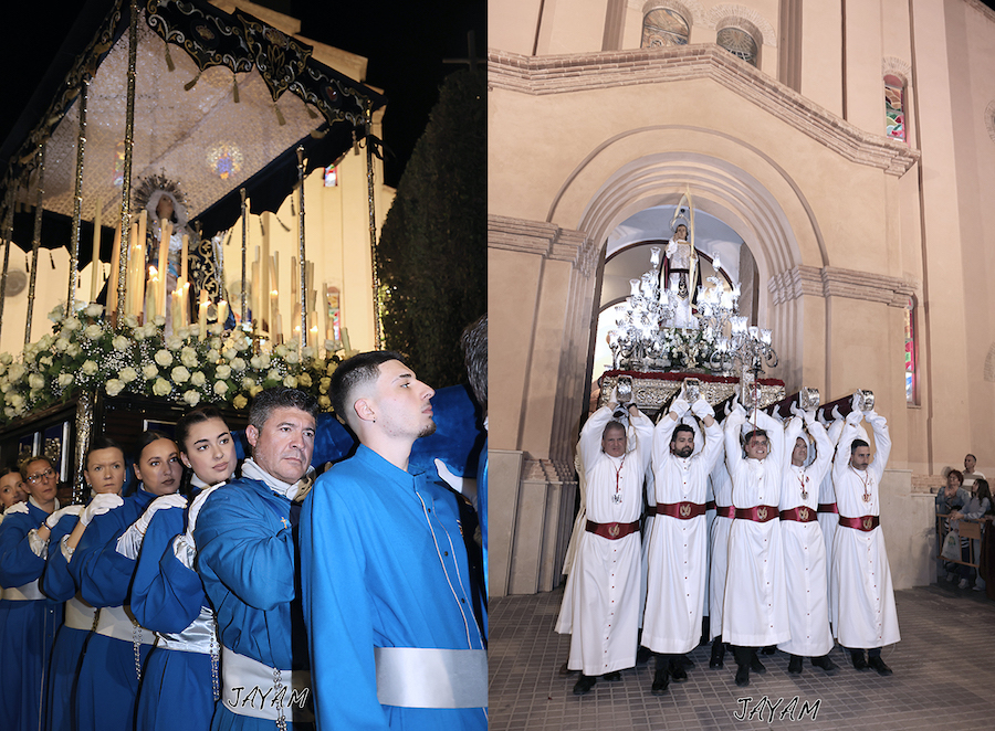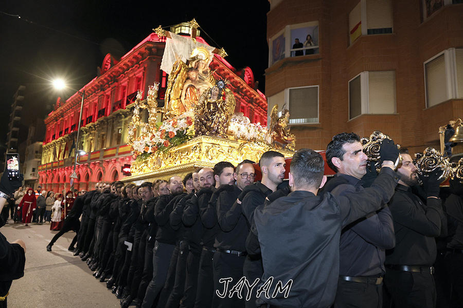 Uno de los alicientes fue escuchar esas oraciones jondas que dedican los finalistas del certamen de saetas y cantes mineros 'Ciudad de La Unión' durante el recorrido: Susana Romero, Iván Segura, José Antonio Romero y Rosario Campos, siendo esta última quien ofreció su voz al encuentro final en la plaza de la Iglesia. Sin embargo, la procesión de anoche (con buen clima) tuvo bastante más que resaltar, pues cada paso tuvo su particular historia o novedad.