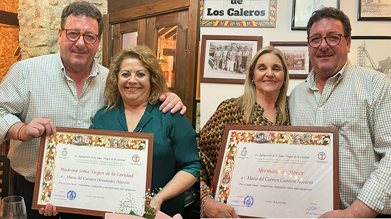 La Agrupación de la Virgen de la Caridad de la Semana Santa Minera ha nombrado como madrina a María del Carmen Hernández Alarcón, quien toma el relevo de María del Carmen Castejón Navarro, quien ha ostentando esa función desde hace años y que pasa a ser 'Hermana de honor' del colectivo cofrade cuya directiva preside Antonio Pagán, a quien se observa en la fotografías con ambas.
