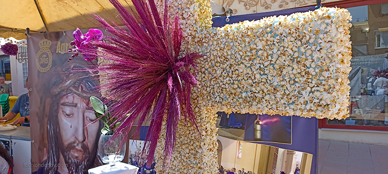 La Agrupación de Jesús Nazareno de la Semana Santa Minera ha elaborado con palomitas la cruz de mayo que luce en su caseta de la plaza de Joaquín Costa durante la celebración de la floreada fiesta de la Cofradía del Cristo de los Mineros.