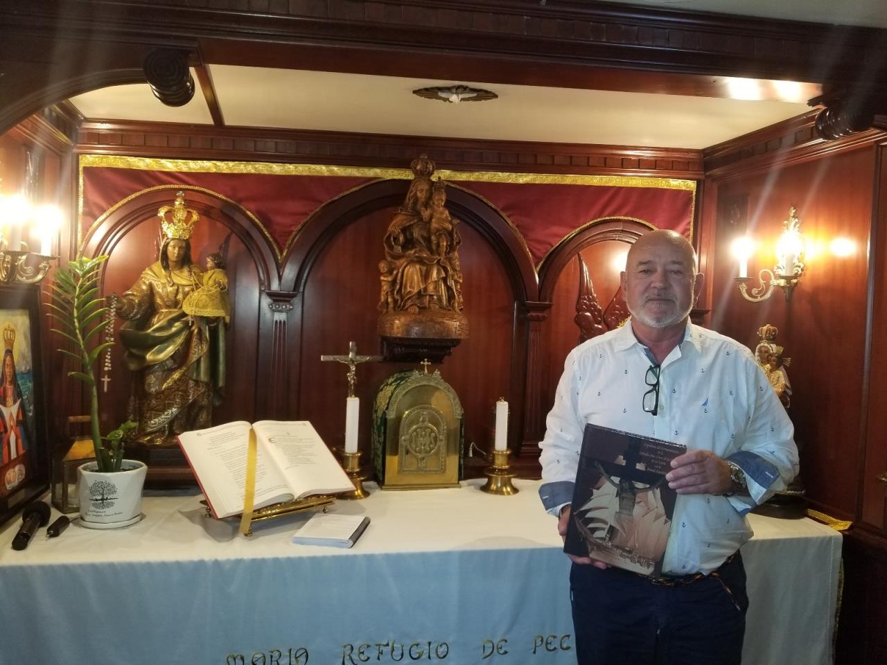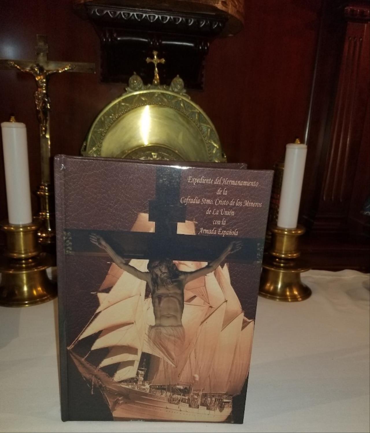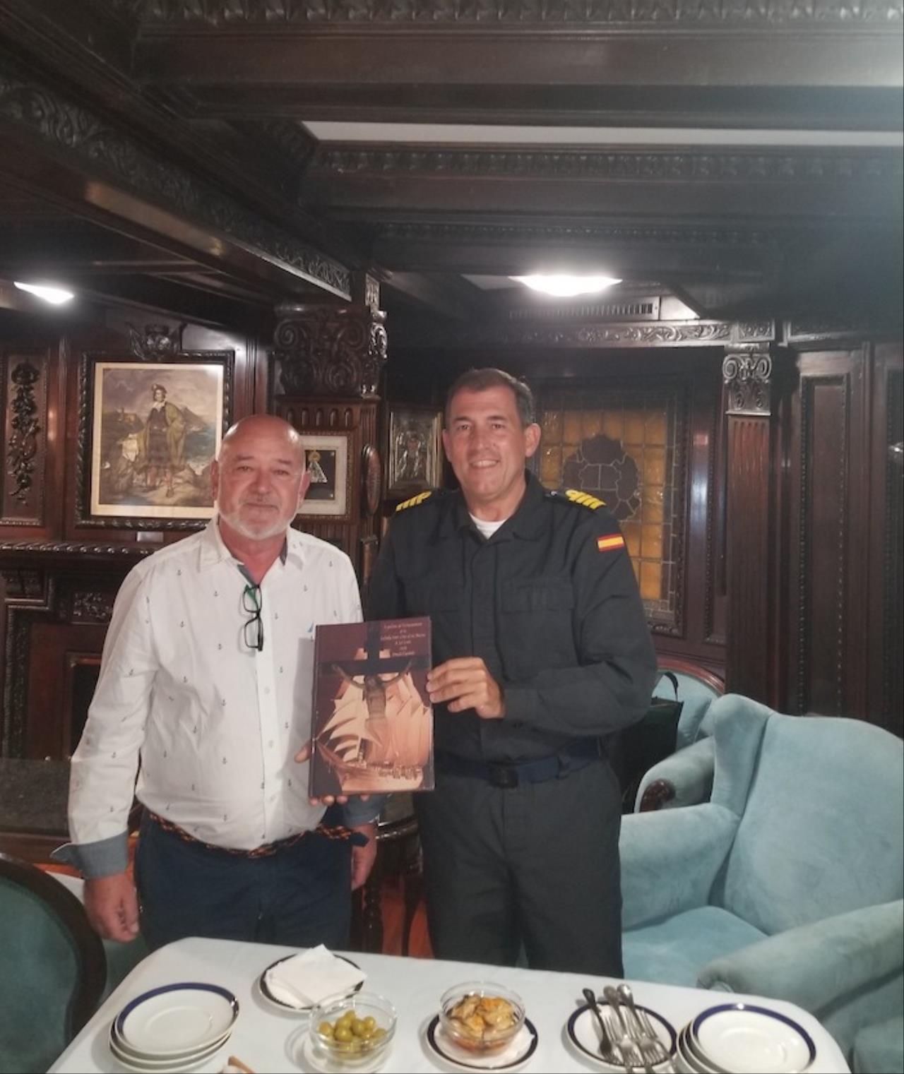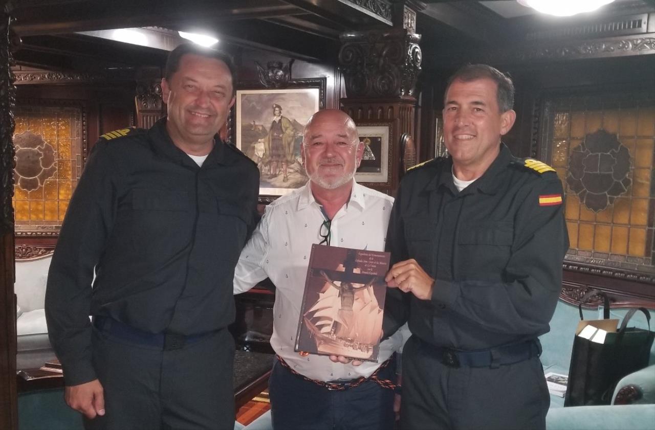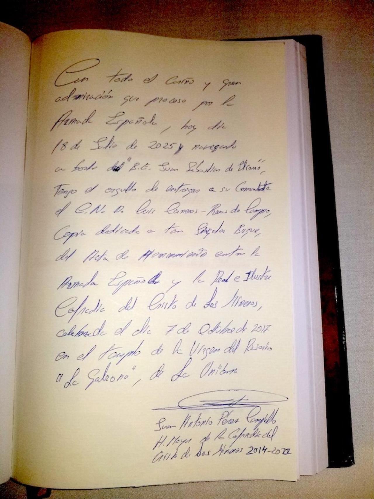 Como unionense y anterior Hermano Mayor de la Cofradía del Cristo de Los Mineros, tuve el honor de entregar al comandante de la nave, un libro, debidamente encuadernado para la ocasión, y dedicado al buque Escuela, donde se recopila minuciosamente toda la documentación, tanto textual como gráfica, referente al hermanamiento entre la Real e Iltre. Cofradía del Stmo. Cristo de Los Mineros de La Unión con la Armada Española, acto que tuvo lugar el día 7 de octubre 2017 en la Iglesia de la Virgen del Rosario. El comandante, visiblemente emocionado, tomo dicho documento y lo deposito en la biblioteca de Elcano, donde viajara por muchos años, por todos los rincones del planeta.