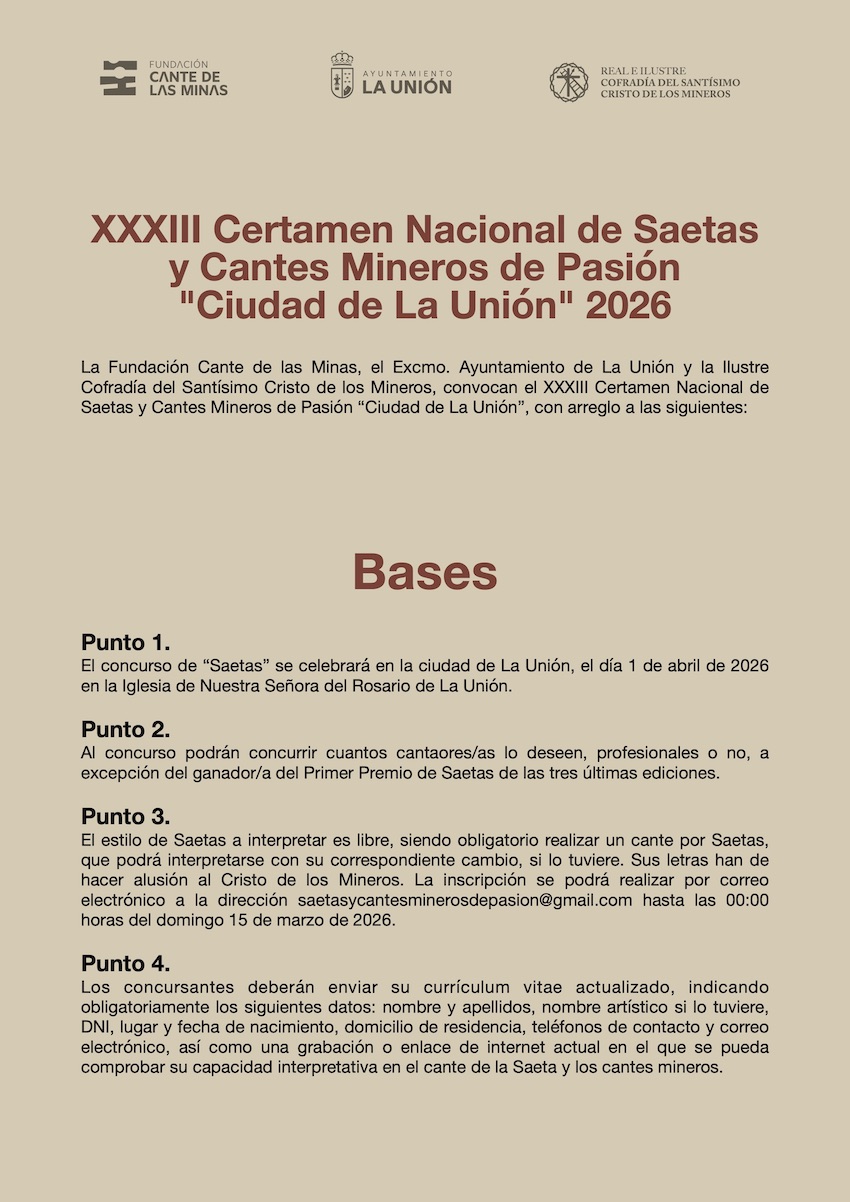 El eco de las minas se vuelve rezo en La Unión. La Fundación Cante de las Minas, junto al Ayuntamiento de la localidad y la Ilustre Cofradía del Santísimo Cristo de los Mineros, ha anunciado la apertura del plazo de inscripción para el XXXIII Certamen Nacional de Saetas y Cantes Mineros de Pasión “Ciudad de La Unión”.