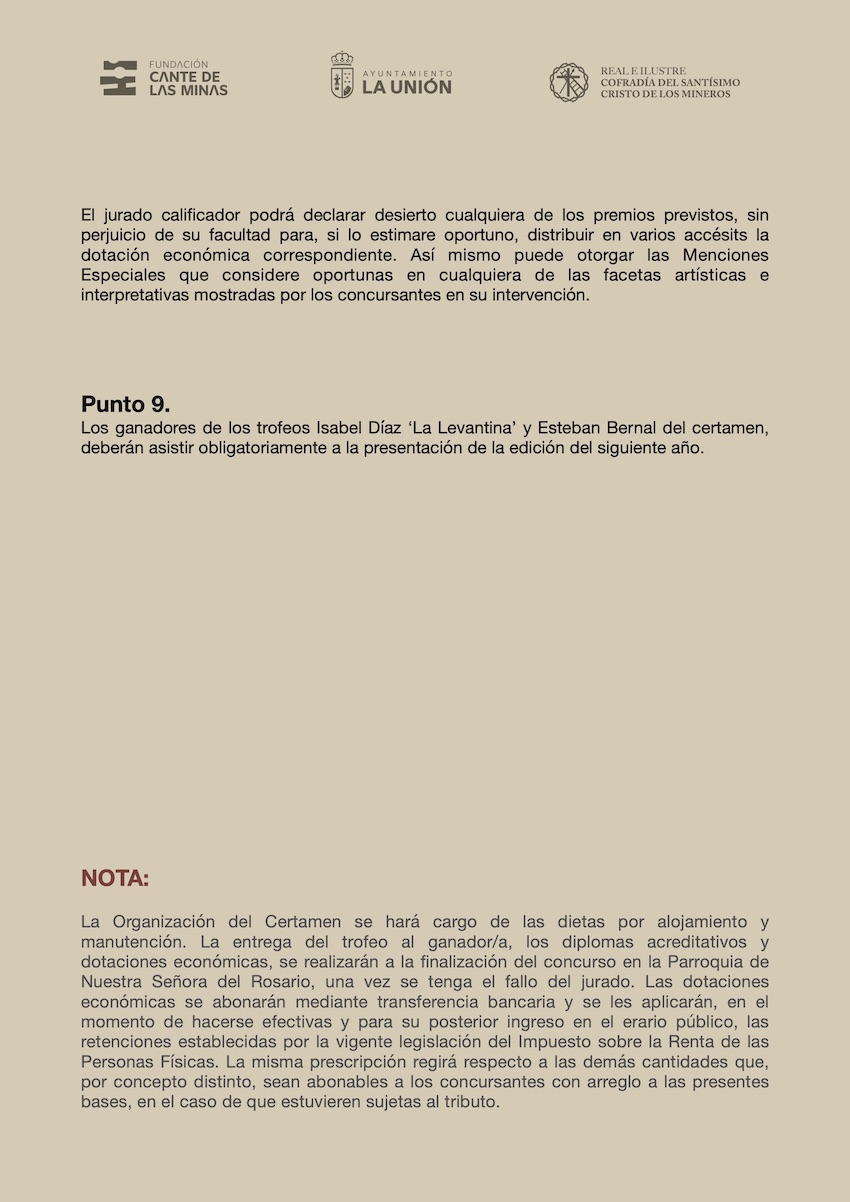 Las bases están disponibles en la web www.fundacioncantedelasminas.org, y además, los interesados pueden solicitar las bases y enviar su documentación al correo electrónico: Esta dirección de correo electrónico está siendo protegida contra los robots de spam. Necesita tener JavaScript habilitado para poder verlo.