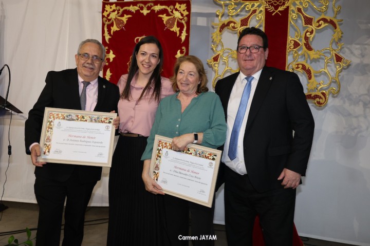 - Virgen de la Caridad: Juan José y Diego Pagán García, por su esfuerzo en pos de que la Virgen volviese a salir en procesión a hombros. Entregó el presidente, Antonio Pagán, quien también anunció que la junta directiva ha acordado nombrar presidente de honor a Alfonso Almagro Martínez, quien también estuvo al frente de la agrupación y por la que sigue trabajando “sin que se le vea”. Después, Laura Rodríguez comunicó que en asamblea extraordinaria, por unanimidad, se acordó nombrar como hermanos de honor a Antonio Rodríguez Izquierdo y Mercedes Cruz Bricio “por toda una vida dedicada a la agrupación”.