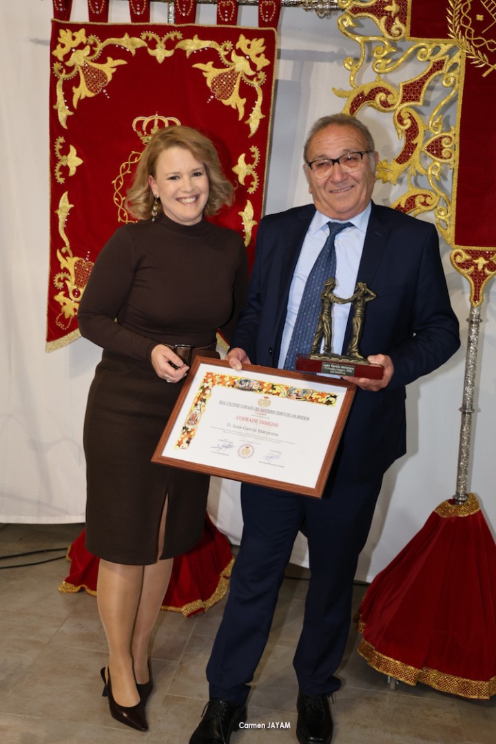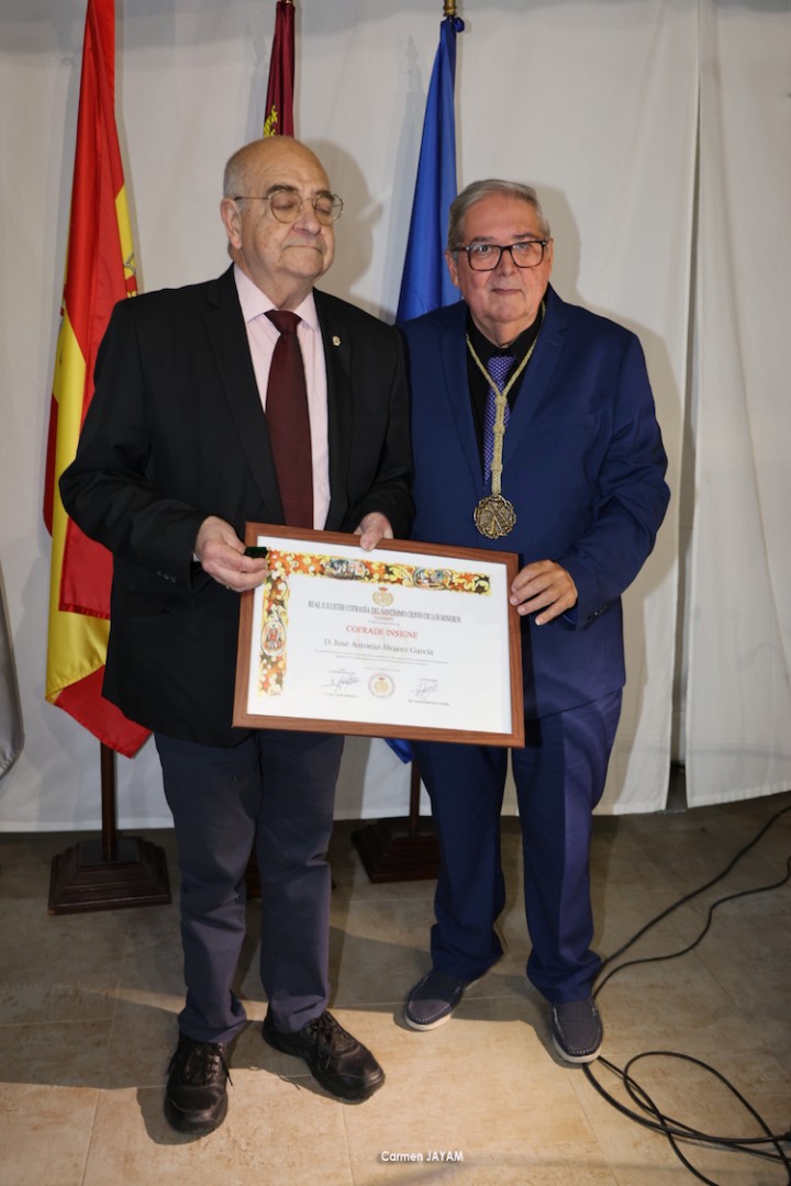 La velada de la familia procesionista de La Unión incluye la entrega de las distinciones de ‘cofrades insignes’ por parte de las agrupaciones dentro de un capítulo que se extendió al nombramiento de Alfonso Almagro como presidente de honor de la Caridad (foto junto a estas líneas) y la imposición de la insignia de plata sanjuanista a Francisco Silvente entre otras distinciones extras.