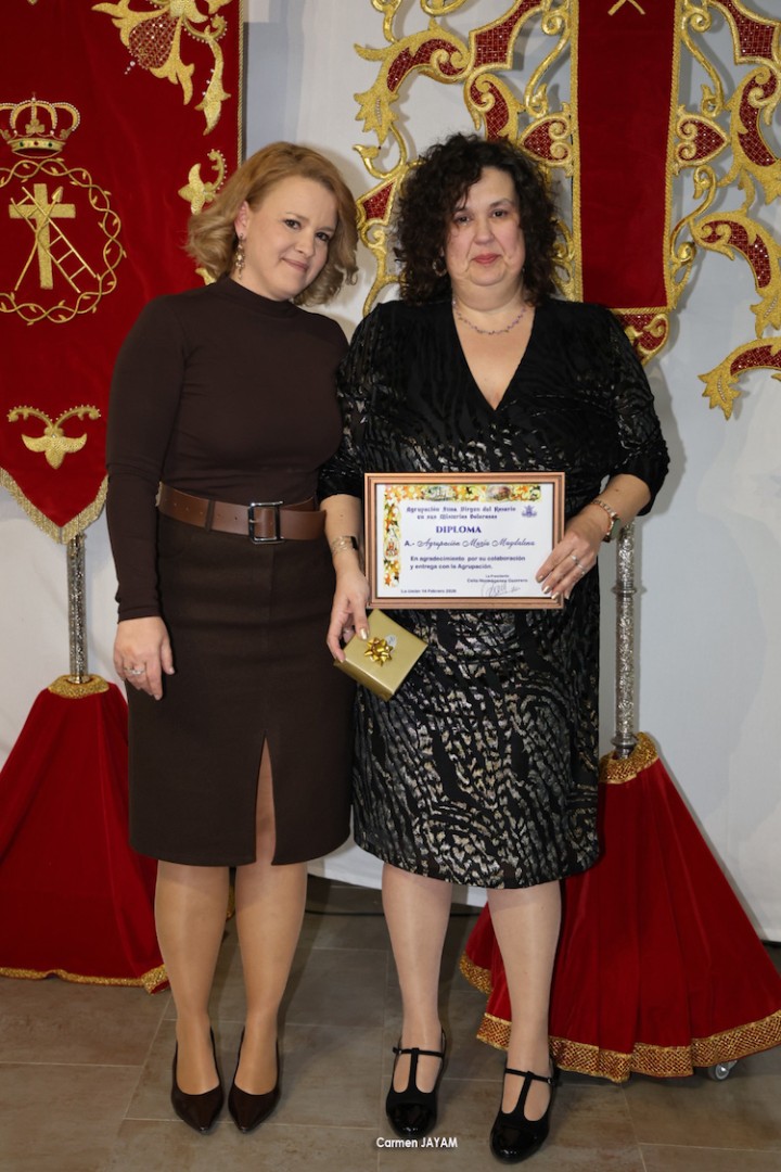 - María Magdalena: Vanesa Montero Roca, por su trabajo hacia la agrupación, por el cariño que se ha granjeado y por su labor como secretaria, expuso la presidenta, Paqui Sáez, quien después fue la agasajada con un reconocimiento por los miembros del colectivo, “su labor ha sido un acto de amor, trabajo y cercanía”, dijeron de ella para agradecer su entrega.