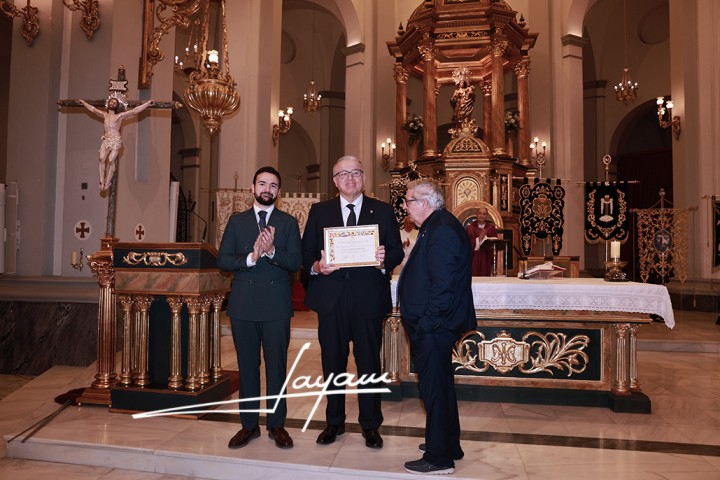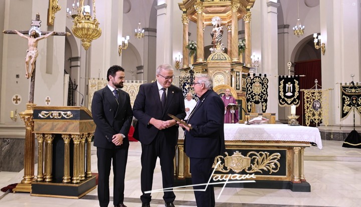 Tras el pregón, José Cortado le hacía entrega del nombramiento de Pregonero y le imponía la insignia de la Cofradía.