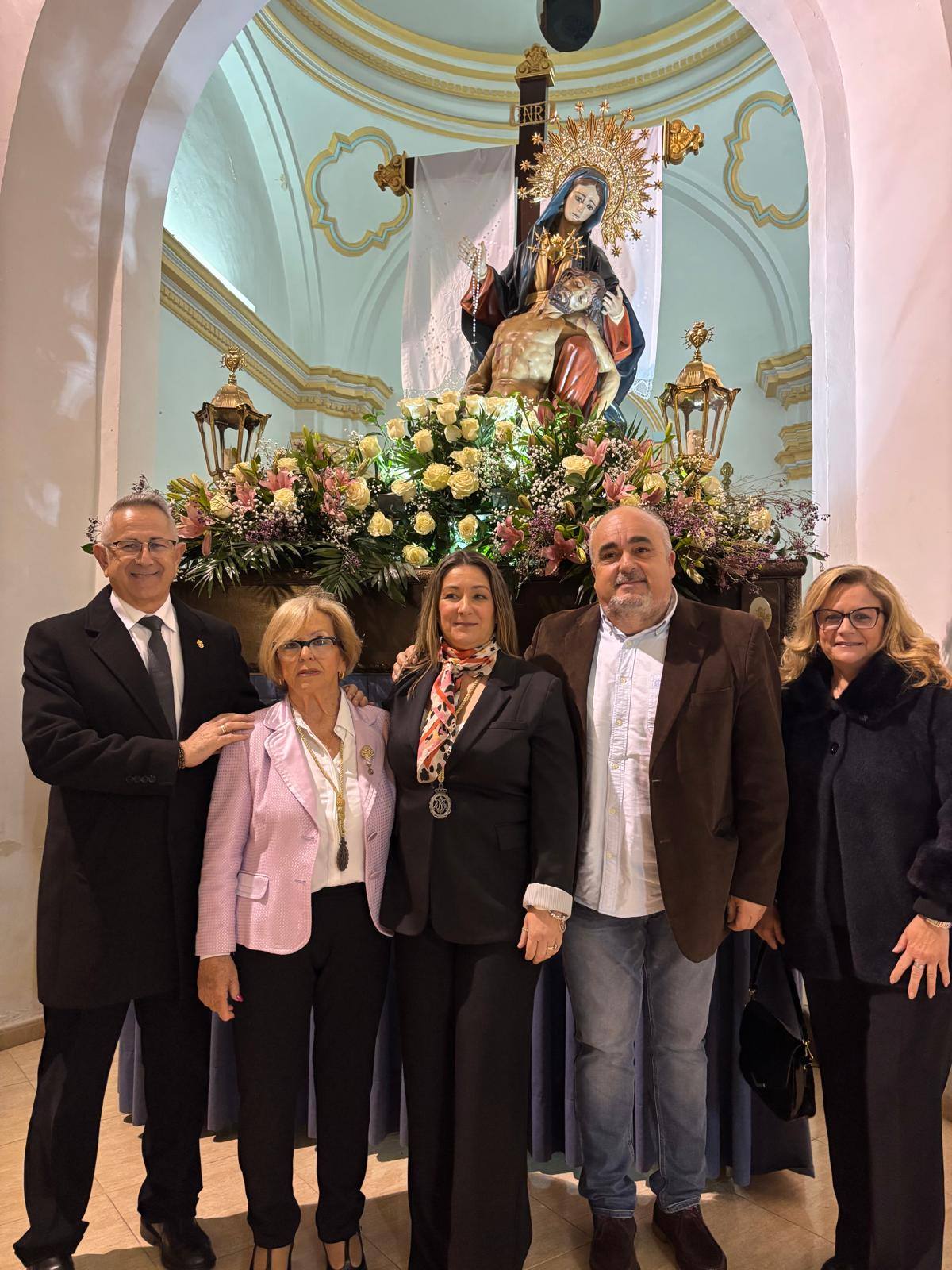 En la imagen posan con la pregonera, con la presidenta de la cofradía alumbreña y con el edil cartagenero Juan Pedro Torralba (Sí Cartagena) ante la imagen de la Virgen de la Caridad que sale en procesión en la noche del Viernes de Dolores. Cabe recordar que Pedro López fue pregonero de la Semana Santa de Alumbres en el año 2024.
