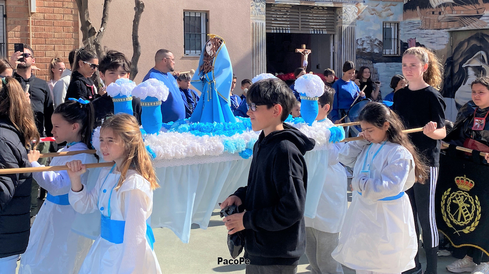 El papel de penitentes, 'manolas', monaguillos, cura, portapasos y personal de Protección Civil lo asumen los alumnos de primero a cuarto curso de Infantil y de cuarto de Primaria, es decir, hasta los nueve años de edad.