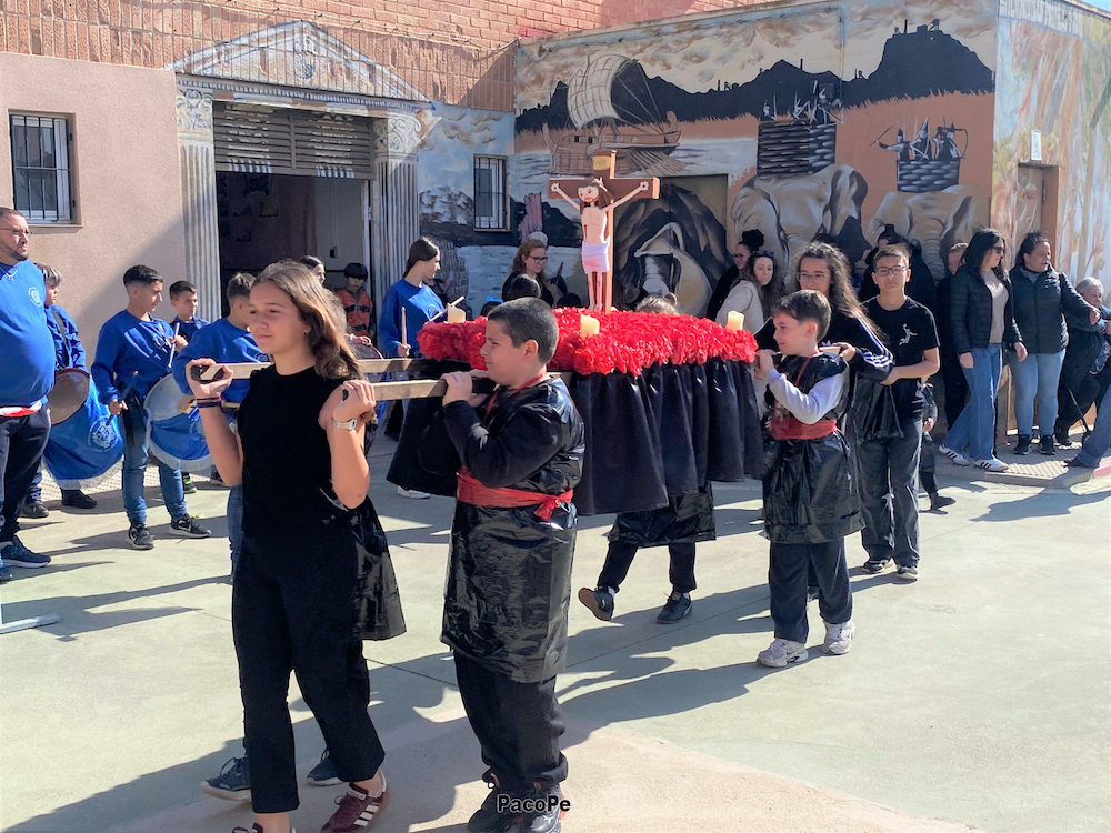 El colegio ha abierto sus puertas para que los vecinos puedan presenciar la puesta en escena, estando entre los presentes el sacerdote Ginés Luis Vicente, las concejalas Teresa López, Damiana García, Loly Mendoza y Aurora Ródenas y la presidenta y varios asociados de la Asociación de Vecinos y Amas de Casa de la villa, además del hermano mayor de la Cofradía del Cristo de los Mineros, José Cortado; el cronista oficial, José Miguel Vegas, y la presidenta de la agrupación de la Dolorosa, Celia Hermógenes, entre otros.