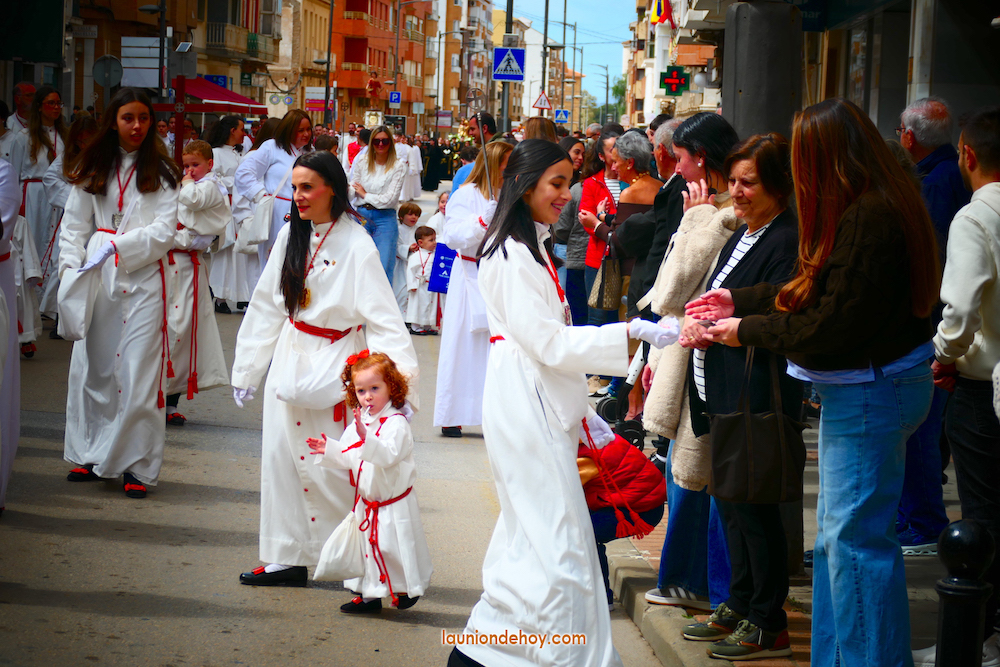 Durante la procesión de 'Los niños de la gavia' se han repartido entre los espectadores estampas de imágenes procesionistas y 5.000 pequeños crespillos mineros en bolsas reutilizables, siendo la principal novedad los muñequitos de penitentes de la Agrupación de María Magdalena.