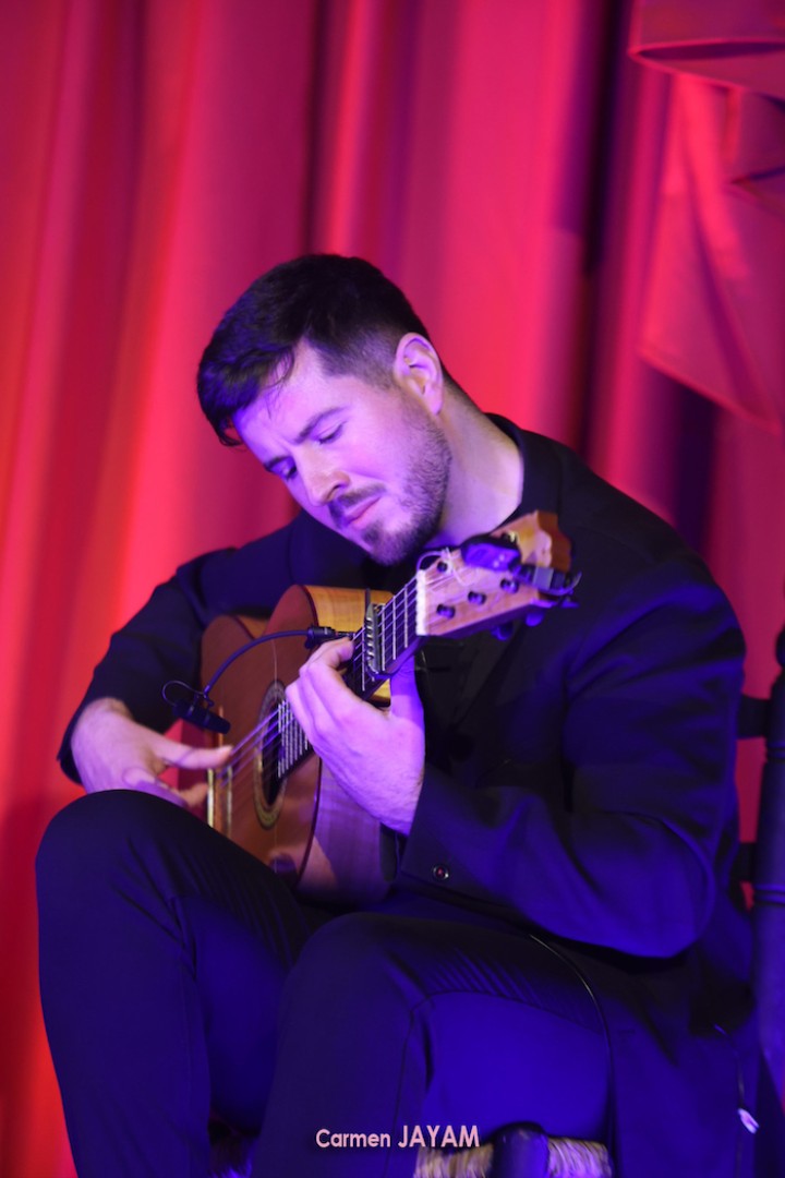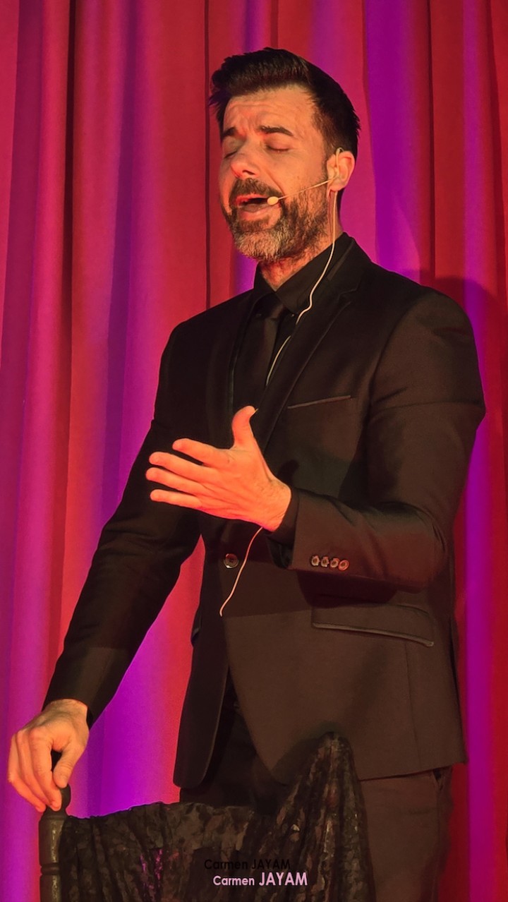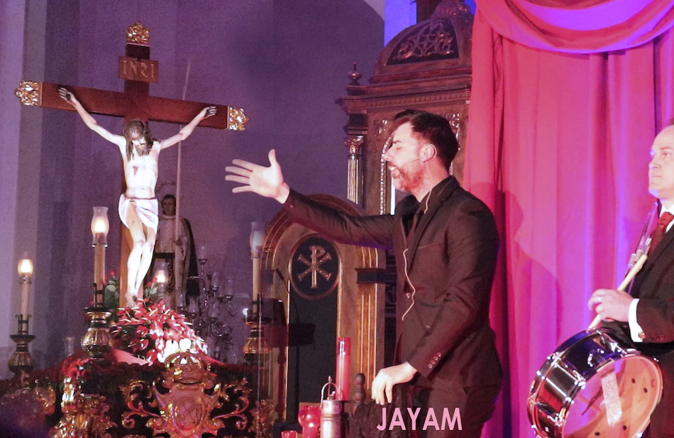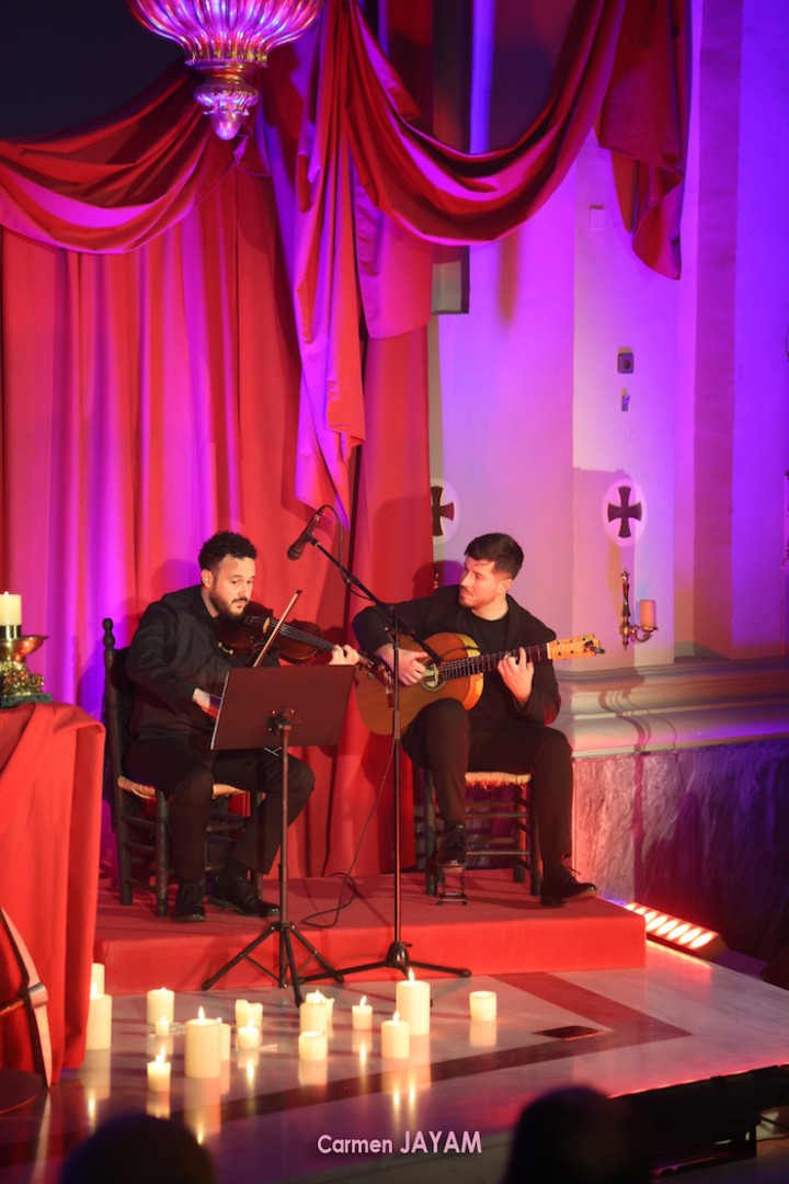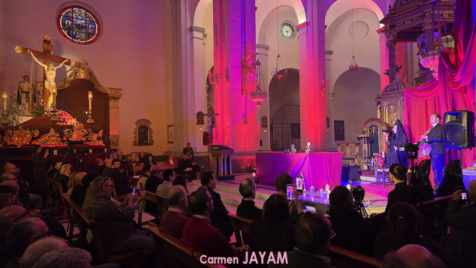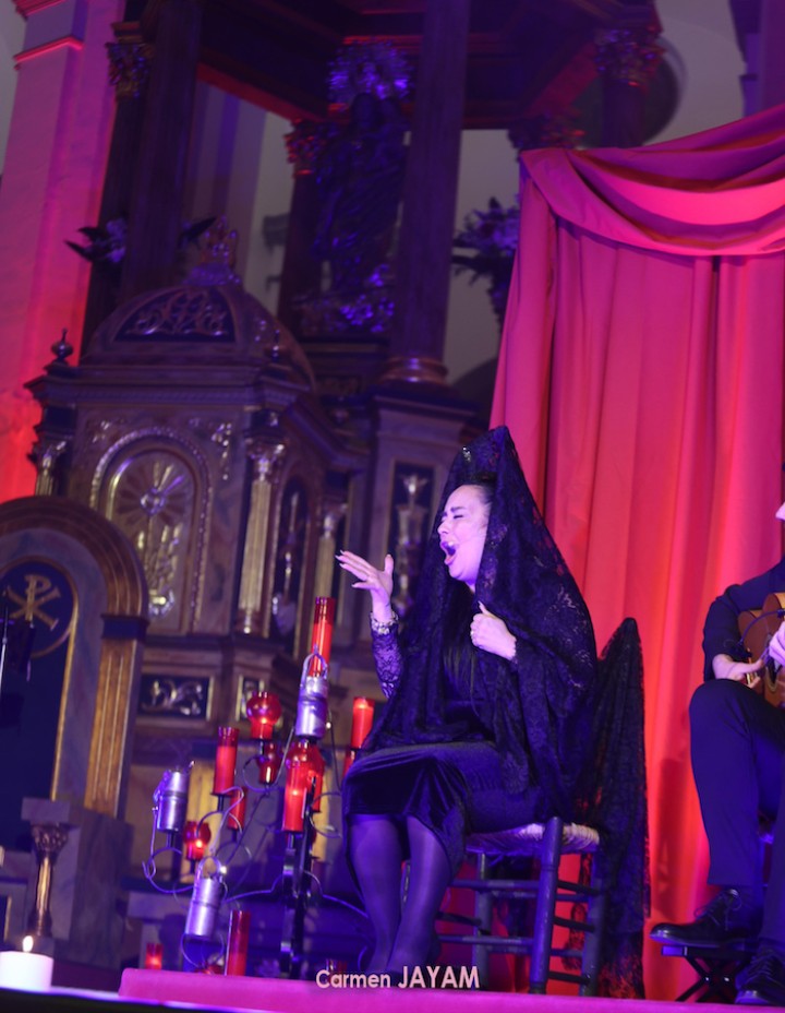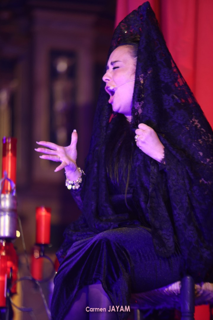 El olor a incienso, el humo suspendido en el aire, la iluminación tenue, las telas rojas colgando del altar y la sobriedad de la silla de anea, de la que cuelga una fina mantilla, junto a las velas que rodean todo el espacio, componían una escenografía de enorme delicadeza. La mantilla, los silencios y el recogimiento del público terminaron de construir un ambiente íntimo y solemne, donde cada cante adquiría una dimensión casi espiritual.