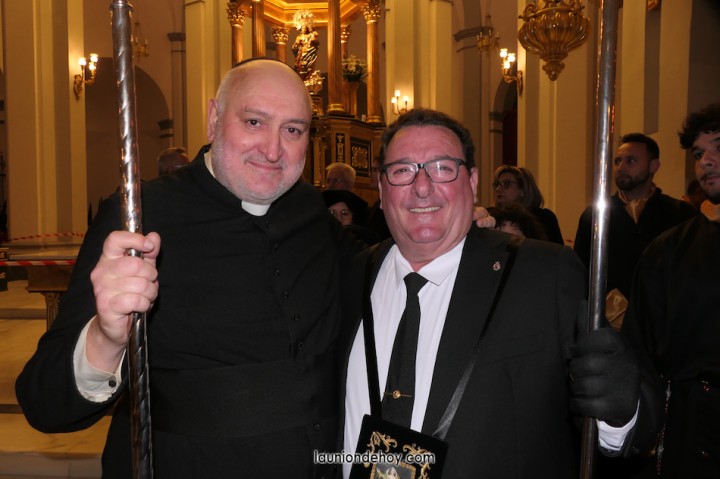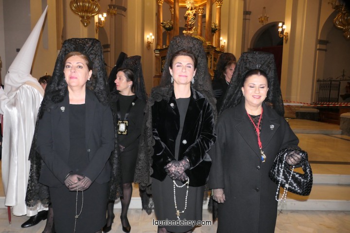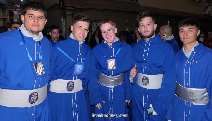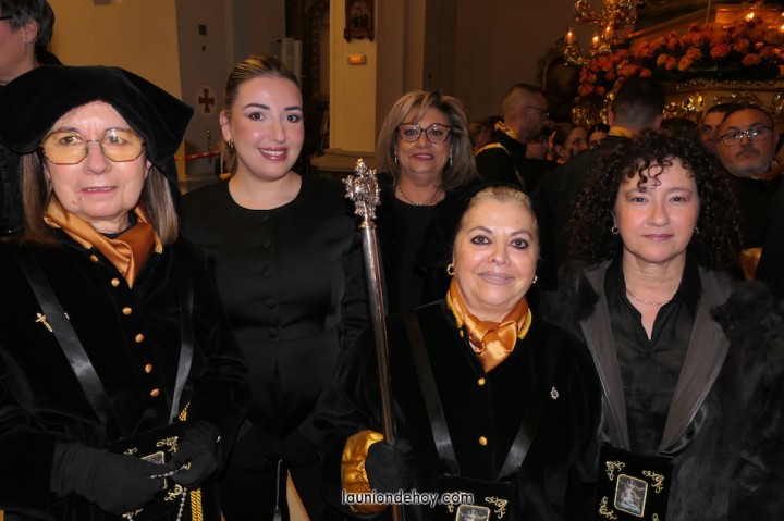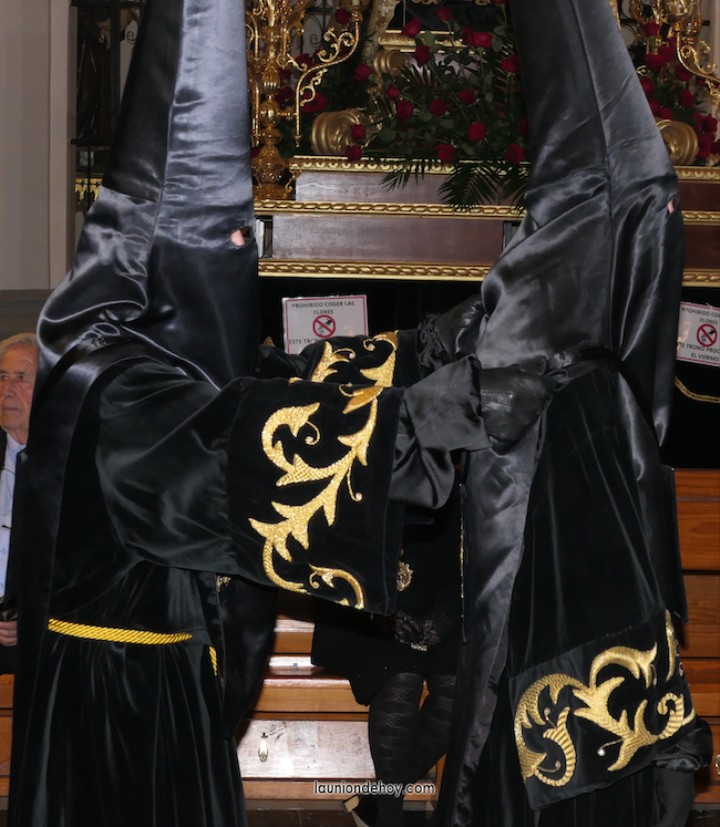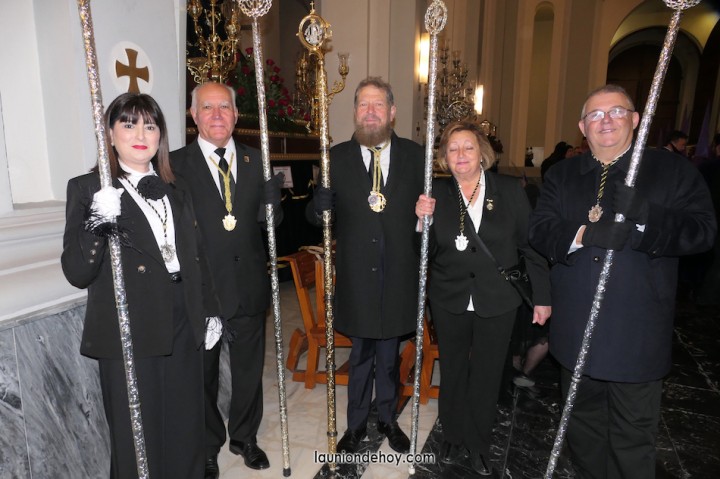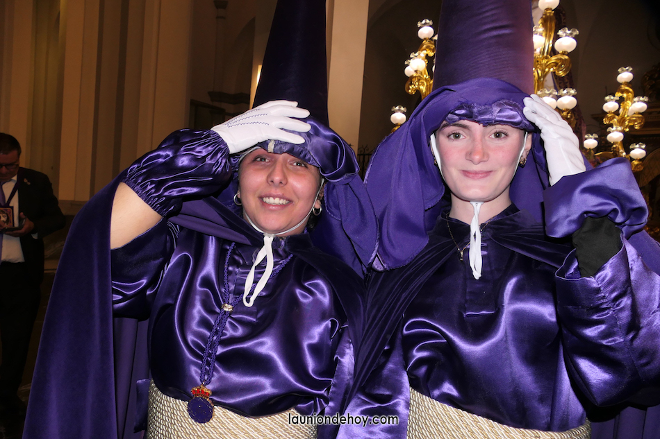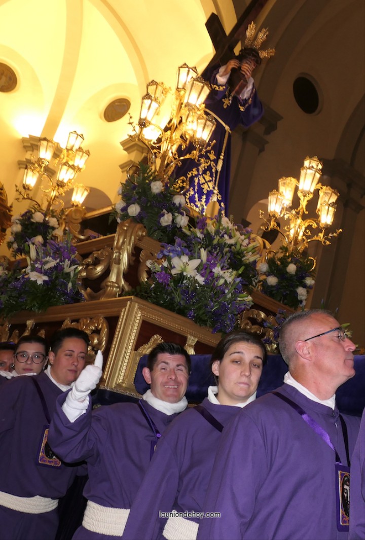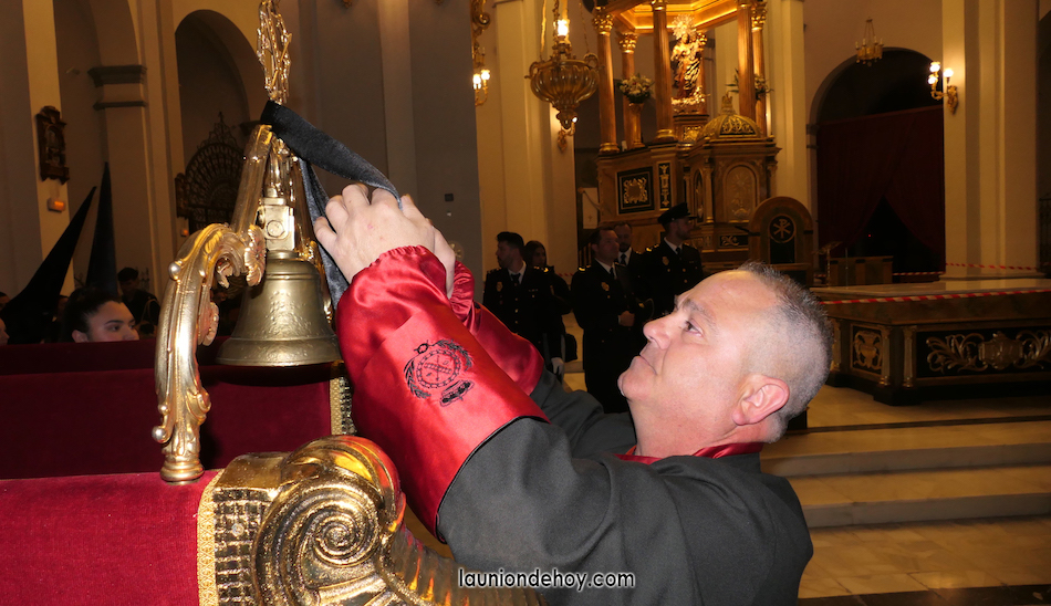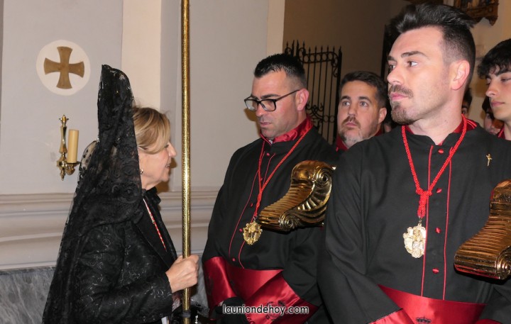 Junto al altar está la representación del PSOE, en el que la edil Leticia Egea forma parte de la Verónica. También el PP tiene edil cofrade con Loly Mendoza, hermana de la Dolorosa, mientras que Isabel Egea (VOX) forma es 'manola'. Por su parte, Daniel Cano, en DLU, mete el hombro en una vara del Nazareno y que esta noche es el encargado de la lectura previa que se le dirige a los costaleros antes de la salida: "Te pedimos que hoy nuestros pies sean uno solo, que el cansancio no nuble nuestra fe y uqe le orgullo de pertenecer a esta Unión nos dé la fuerza que el cuerpo nos niegue, que cada rincón de nuestro barrio...". También destacamos la presencia en el cortejo de otros colectivos religiosos amigos, como son los de la Cofradía del Cristo de la Misericordia de Cartagena y de la Hermanad de Romeros de San Ginés.
