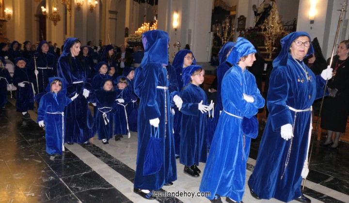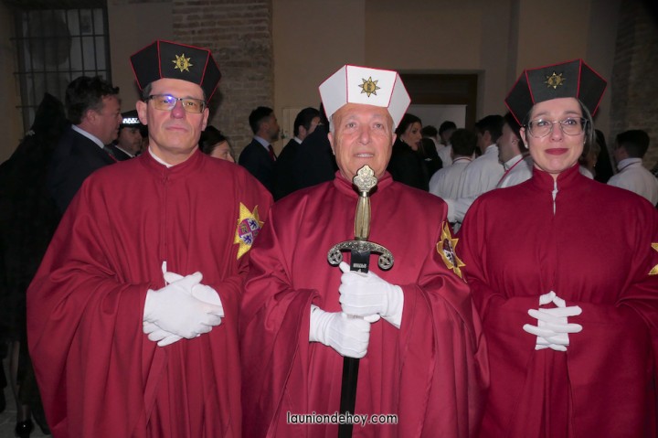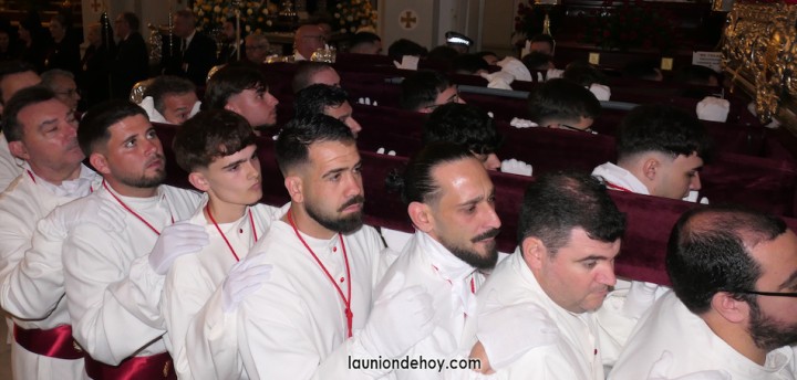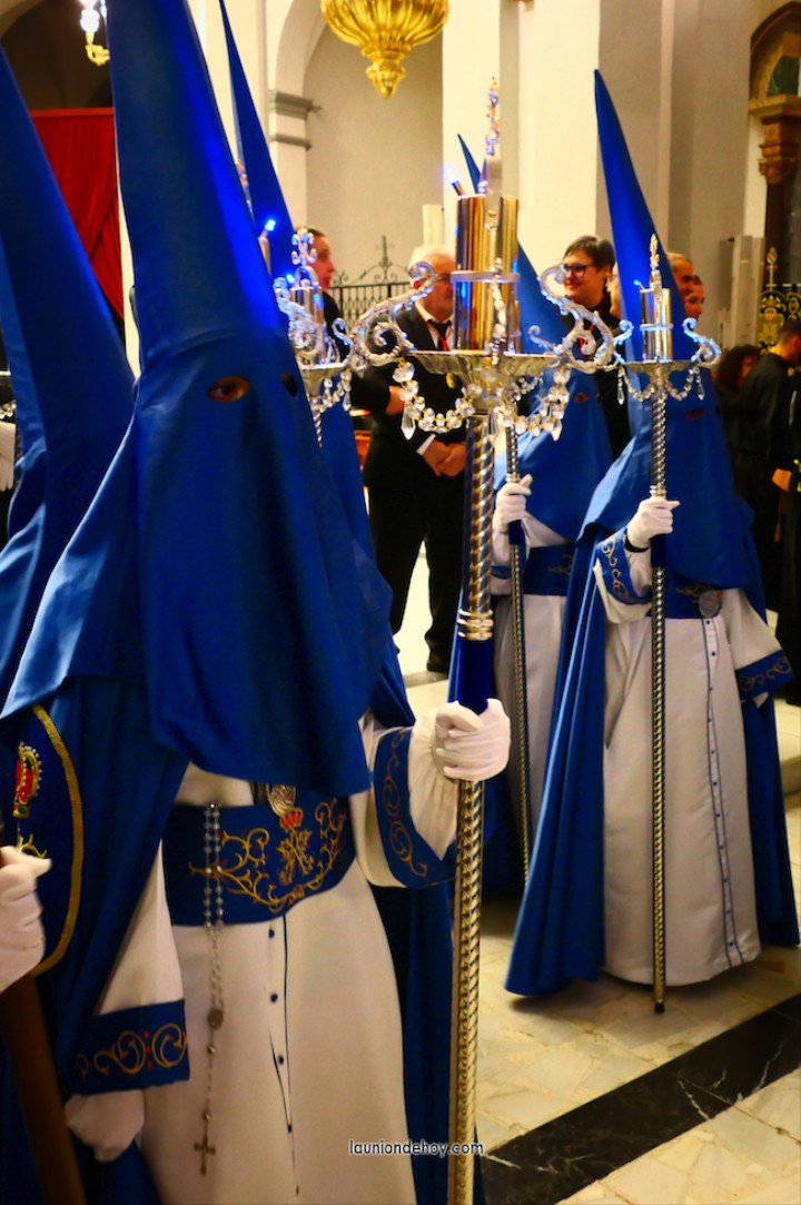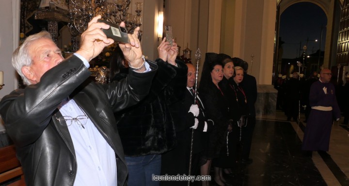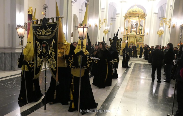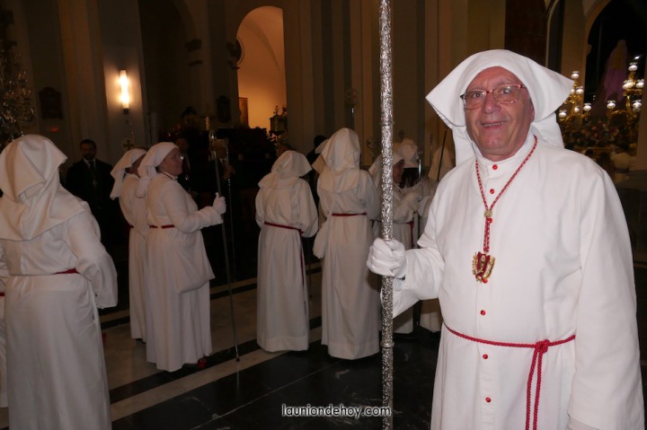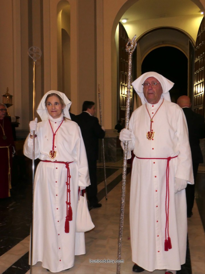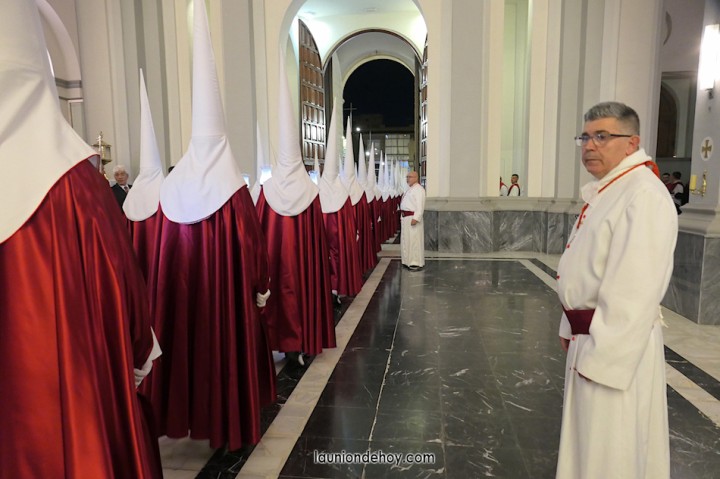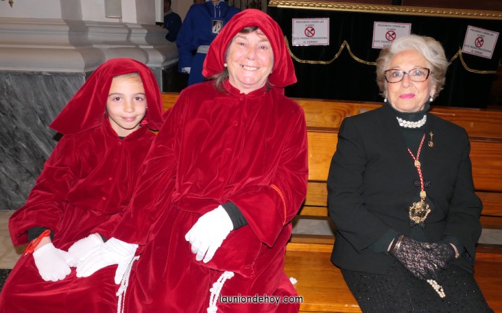 Todos esperan en el exterior hasta que van entrando conforme al orden de salida. En el interior todo transcurre de forma casi perfecta merced al buen trabajo del equipo de iglesia y de los coordinadores de cada agrupación. Las autoridades son de las primeras personas en entrar, situándose en un lateral para contemplar cómo va saliendo todo el cortejo. Entre ellos está el concejal Francisco García Molina, que ha anunciado que deja el cargo, por lo que vive sus últimas jornadas como edil. Junto al equipo de gobierno (PP) está el senador Francisco Bernabé, sumándose el cronista oficial de La Unión, Gonzalo Wandosell, y el hermano mayor cofrade, José Cortado.
