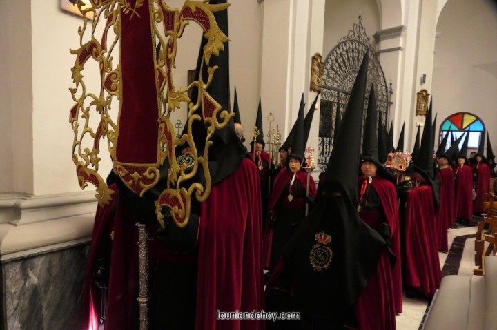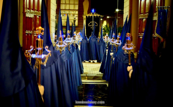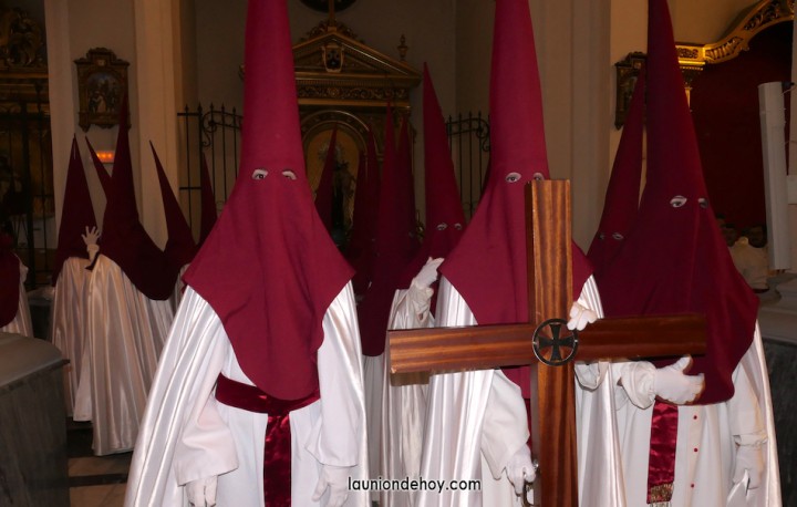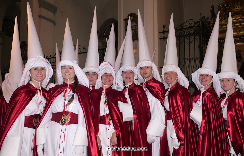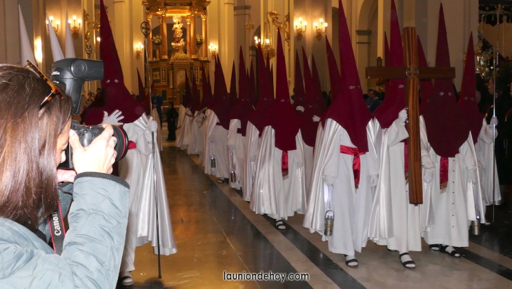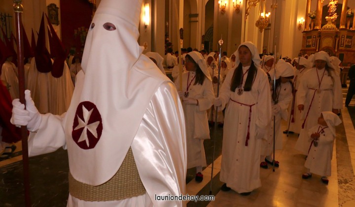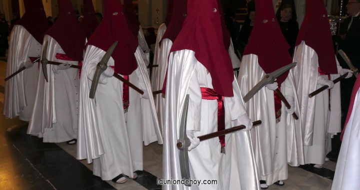 Se acerca la hora de comenzar la procesión del Jueves Santo en la ciudad de La Unión y por las calles comienzan a verse cada vez más personas con atuendo procesionista andando con dirección hacia el templo de la patrona, lugar donde cada año emergen las procesiones. También los hay que llegan en turismos que se detienen unos instantes lo más cerca posible para que se bajen.