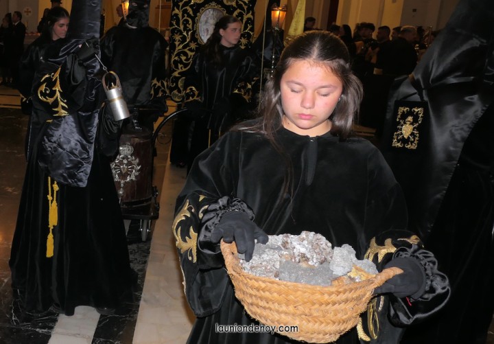 Los tronos a hombros que han cruzado la puerta van con caballeros y damas portapasos, en un ejemplo de paridad. Lo mismo sucede con el que lleva a la Virgen de la Caridad, que representa a Jesús muerto sobre el regazo de su madre. El negro, especialmente, y el amarillo distingue a su tercio, que cierra el yunque. También son singulares sus candiles.