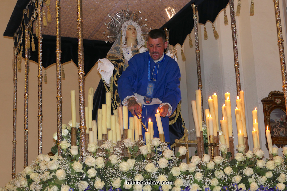 Las penitentes llevan los mensajes 'Stobot Moter Doloroso' (motor dolorsamente silencioso) y 'Dum Pendebat Filium' (mientras ahorcaba a su hijo) junto a galas con el corazón atravesado por un puñal y otras con la imagen y símbolos de la Virgen, cerrando la imagen bajo palio y rodeada de velas y flores, pero hay que destacar que en la Semana Santa Minera el adorno floral es el justo para lucir sin tapar.