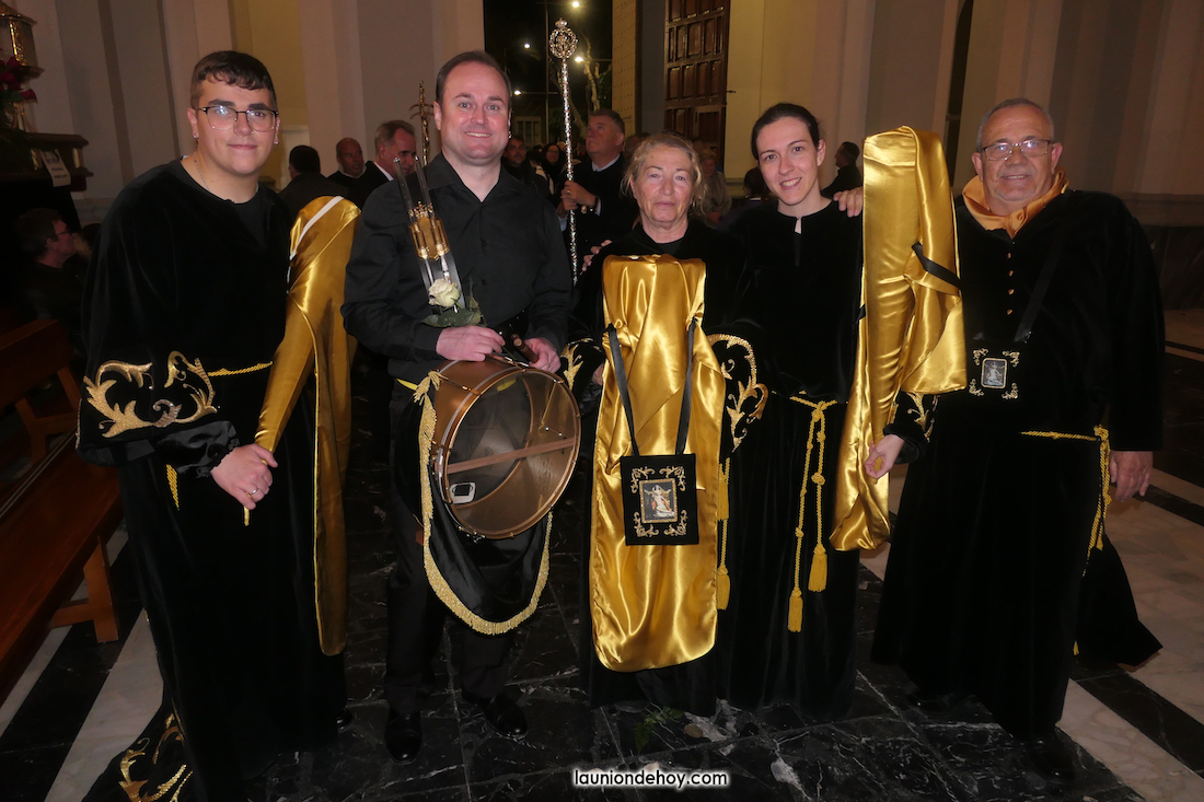 Aimar, José Antonio, Merce, Laura y Antonio, de la Agrupación de la Virgen de la Caridad, en el interior de la iglesia del Rosario tras terminar la procesión del Jueves Santo en la ciudad de La Unión.