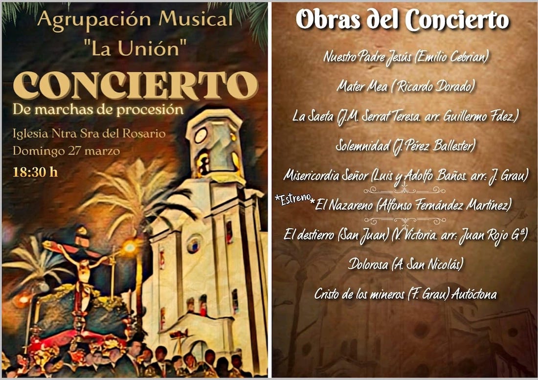 La pieza creada para la agrupación local del mismo nombre será uno de los nueve temas de Semana Santa que la Agrupación Musical La Unión ofrecerá este próximo domingo, a partir de las 18.30 horas, en el concierto que ofrecerá en la iglesia de Nuestra Señora del Rosario, contando con la presencia de su autor, Alfonso Fernández Martínez.