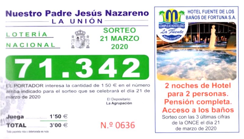 El 'Estado de alarma' decretado por el Gobierno de España el pasado día 14 de marzo (RD 463/2020) tuvo, entre otras consecuencias, la suspensión de los sorteos de Lotería Nacional, así como los sorteos de la ONCE. El sorteo que tradicionalmente celebra el colectivo procesionista previo a Semana Santa, que iba a tener lugar el 21 de marzo con números para ambos juegos, quedó suspendido por esta circunstancia. Al volver ahora a iniciar su actividad ambos, esta jugada pendiente queda de la siguiente manera: