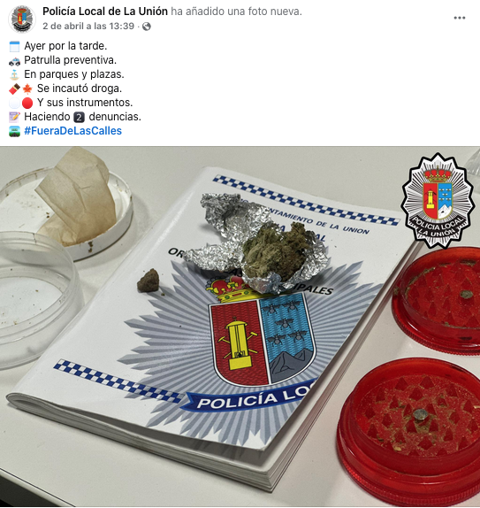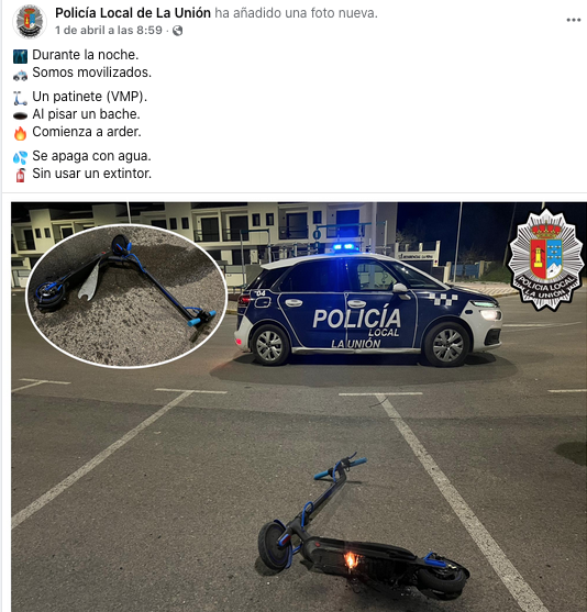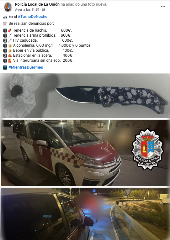 La Policía Local de La Unión informa que esta semana, en un turno nocturno, sancionó a una persona por tenencia de hachís y de navaja, por ITV caducada, por beber en la vía pública, por dar positivo en alcoholemia, por estacionar el vehículo en la acera y por estar en vía interurbana sin chaleco. El cuerpo municipal también da a conocer un patinete que ardió al pisar un bache, la identificación de quien se llevó un grifo de una instalación pública y de nuevas incautaciones de droga.