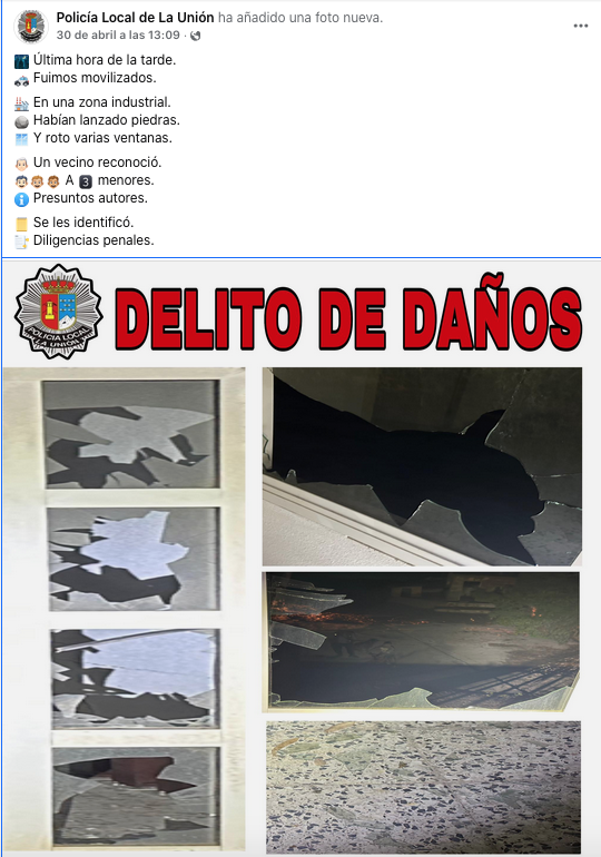 Vecinos reconocieron a tres adolescentes que rompieron piedras en una zona industrial tirando piedras, lo que ha permitido a la Policía Local su identificación y apertura de diligencias penales. Otra actuaciones del cuerpo de seguridad municipal en los últimos días ha sido el arresto de una persona por alteración del orden público en un local público y por resistencia a la autoridad. También intervinieron con una persona que estaba en actitud agresiva con riesgo para su vida y la de sus familiares. Fue trasladado al hospital.