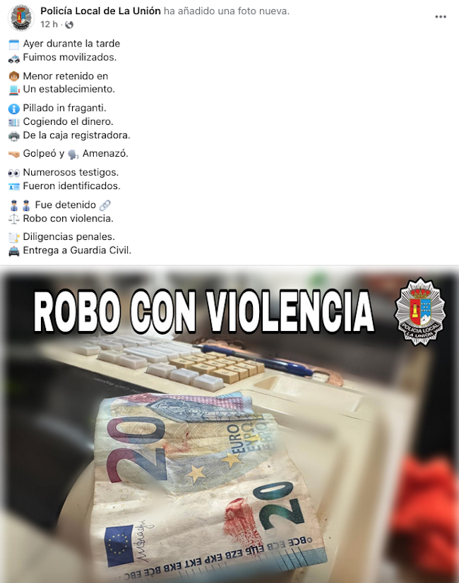 El autor, que es menor de edad, fue retenido en el establecimiento y después identificado y detenido por la Policía Local en una de sus actuaciones de los últimos días, entre las que también figuran las multas que suman más de dos mil euros a un conductor y la incautación de una navaja prohibida en zona de fiesta. El cuerpo municipal también informa del robo de una moto en Portmán y de una farola derribada.