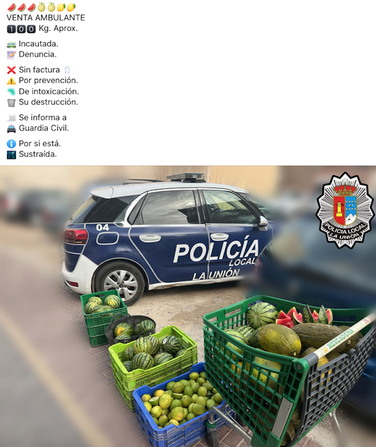 La Policía Local de La Unión llevó a cabo la incautación de un centenar de kilos de diversos productos hortofrutícolas durante la celebración del mercadillo de este pasado martes. Carecía de factura y se sospechaba de que podían haber sido conseguidas a través de la sustracción. Por otro lado, un conato de incendio en una vivienda fue sofocado por los propios moradores. El origen, según fuentes policiales, podría estar en una candela de cera.