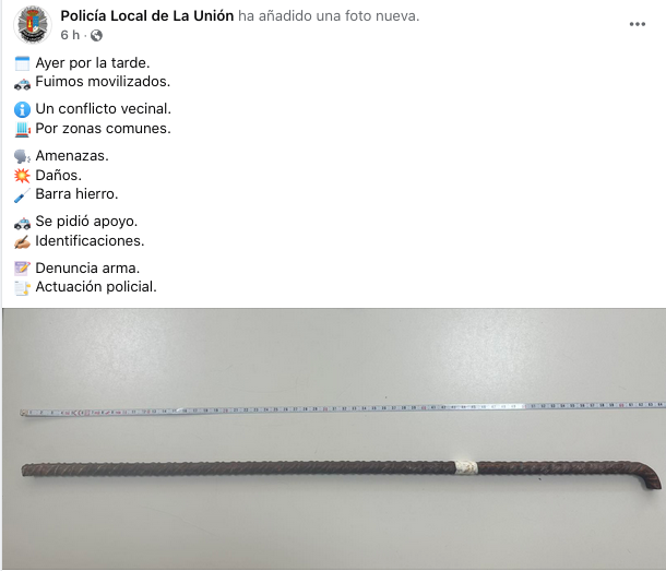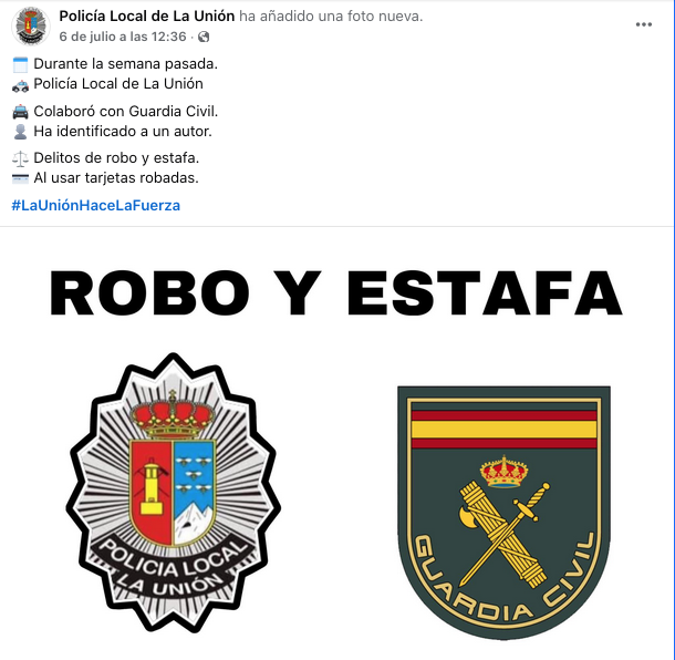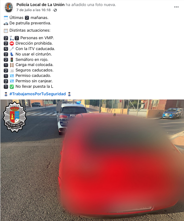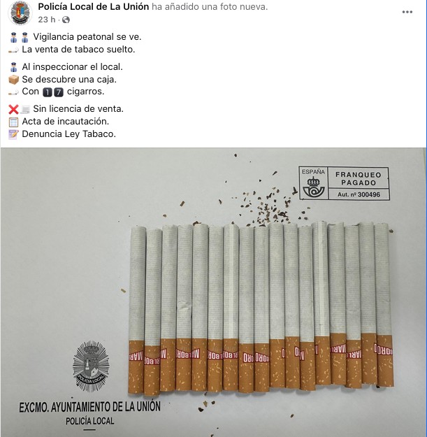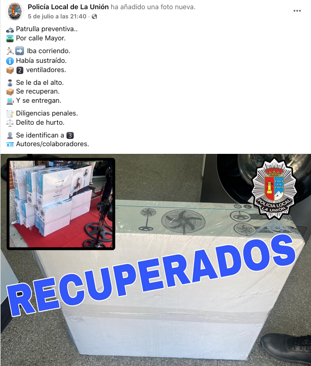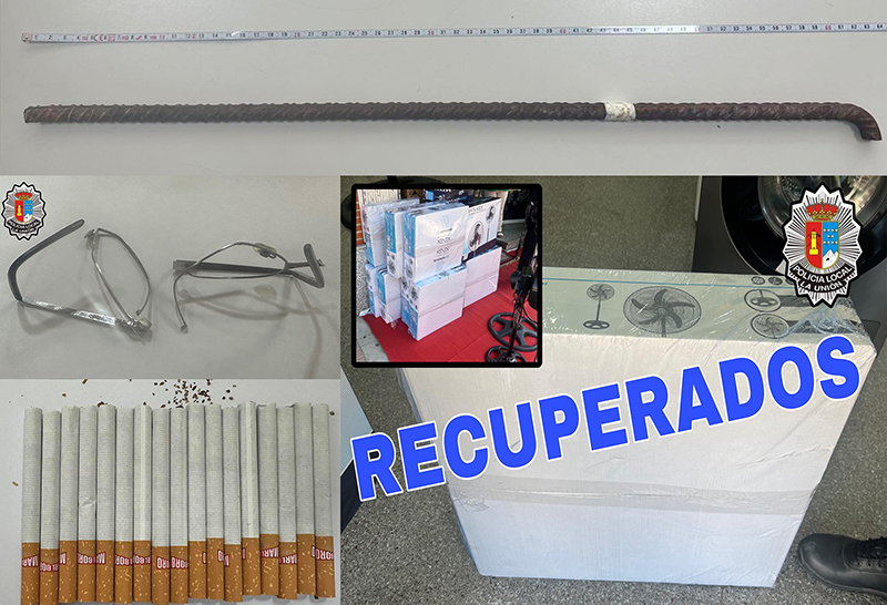 Entre las actuaciones que la Policía Local de La Unión da a conocer en su portal de 'Facebook' figuran dos ventiladores recuperados que habían sido hurtados de un comercio, la identificación de quien usó tarjetas de crédito robadas, la incautación de cigarrillos que se vendían sin licencia y las intervenciones en una agresión en la vía pública con lesiones y gafas rotas y otra en un conflicto vecinal con uso de una barra de hierro, además de una veintena de denuncias impuestas en dos mañanas por asuntos de tráfico.