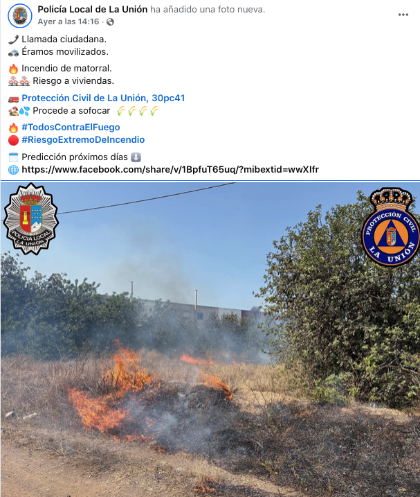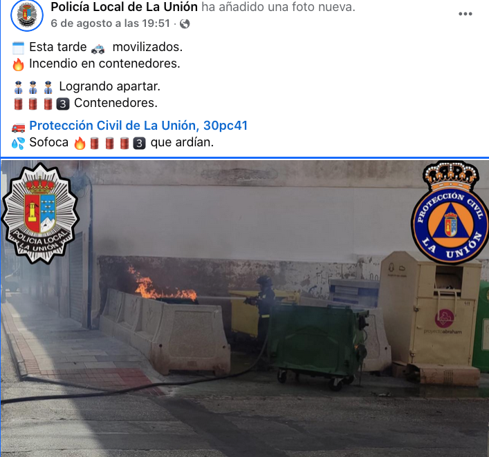 Protección Civil y Policía Local informan de dos fuegos que se han declarados en las últimas fechas, uno en 3 contenedores en la zona urbana de La Unión y otro en unos matorrales, próximos a unas viviendas.