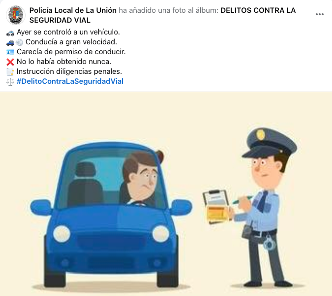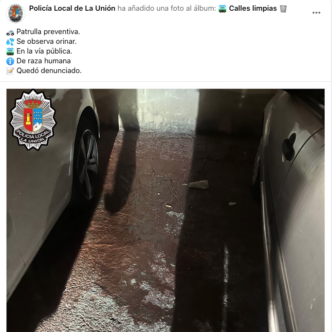 La Policía Local de La Unión le hizo el alto al ver que iba a gran velocidad, descubriendo que nunca había obtenido el permiso de conducir, por lo que se le abrieron diligencias penales. El cuerpo municipal también informa de la sanción a una persona por orinar en la vía pública.