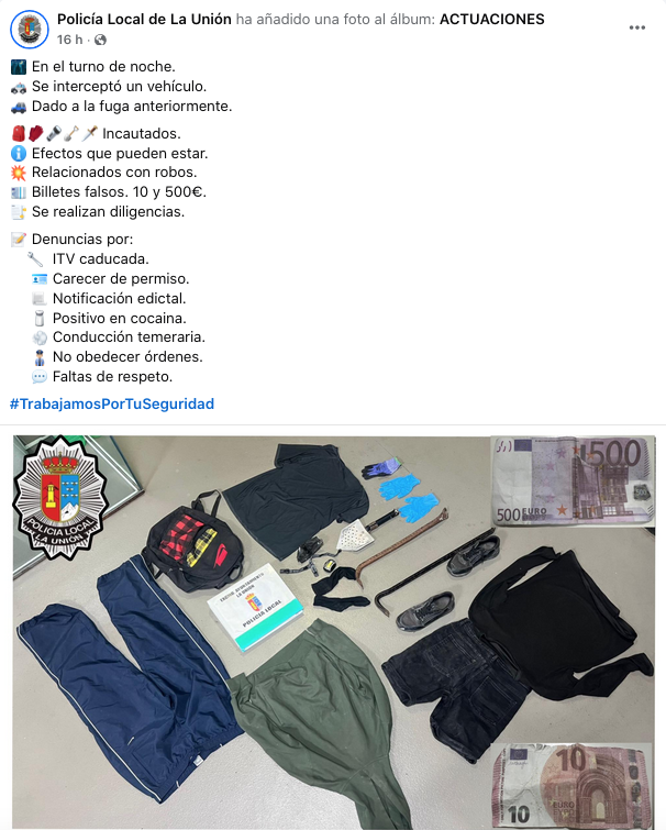 La Policía Local de La Unión interceptó un turismo que se había dado a la fuga y en el que encontraron billetes falsos, además de que el conductor dio positivo en cocaína, a lo que se unieron la conducción temerearía, la desobediencia y falta de respeto a la autoridad, carecer de permiso, ITV caducada...