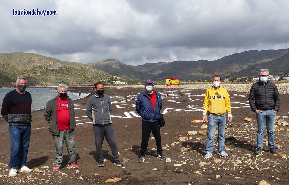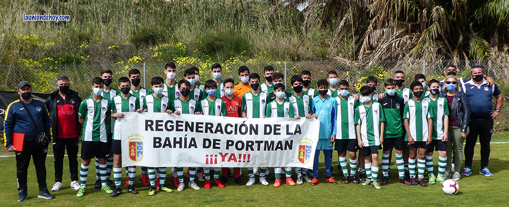 El día en el que se cumplen los dos años desde que se paralizaron los trabajos de regeneración, los vecinos escriben sobre la arena de la playa de San Bruno ‘2 años. SOS Portmán. No más engaños’ y colocan un cartel con mensajes para las tres administraciones, además de resaltar que ahora se ha incumplido la convocatoria de la comisión de seguimiento establecida por convenio. Por su parte, el equipo de la AD Portmán At. ha posado con una pancarta alusiva antes de comenzar su partido.