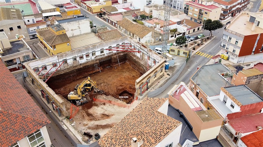 Imagen aérea captada por Juanjo Carrillo ('la-union-ciudad-del-cante-y-minera.es’) en la que se observa los trabajos que se llevan a cabo en el edifico del Liceo, que en esta fase se centra en habilitar el hueco del sótano.