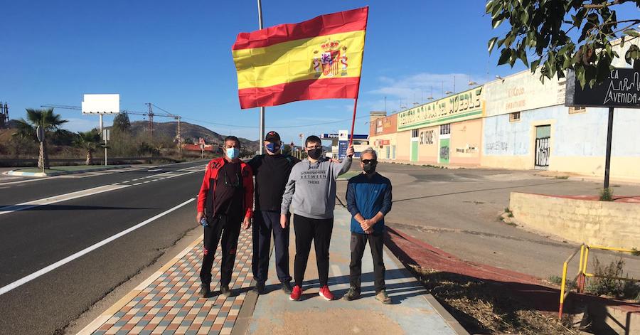 Grupo de senderistas que esta mañana han iniciado una ruta desde La Unión por la sierra minera y que portaban una enseña de España con el propósito de instalarla en lo alto de un cabezo.