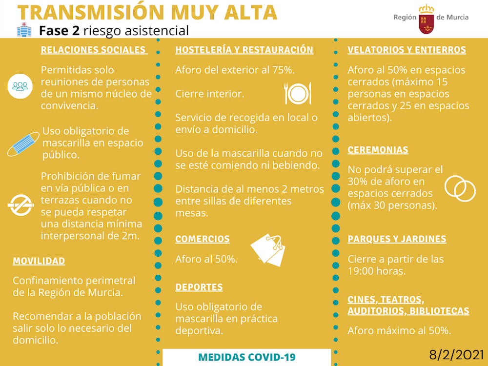 La medida acordada por el comité de seguimiento covid de la Región de Murcia se hace efectiva, con un 75% máximo de ocupación, a partir de este miércoles para 20 de los 45 municipios autonómicos que ya no están en situación de nivel de riesgo extremo, ha anunciado el nuevo consejero de Salud, Juan José Pedreño.