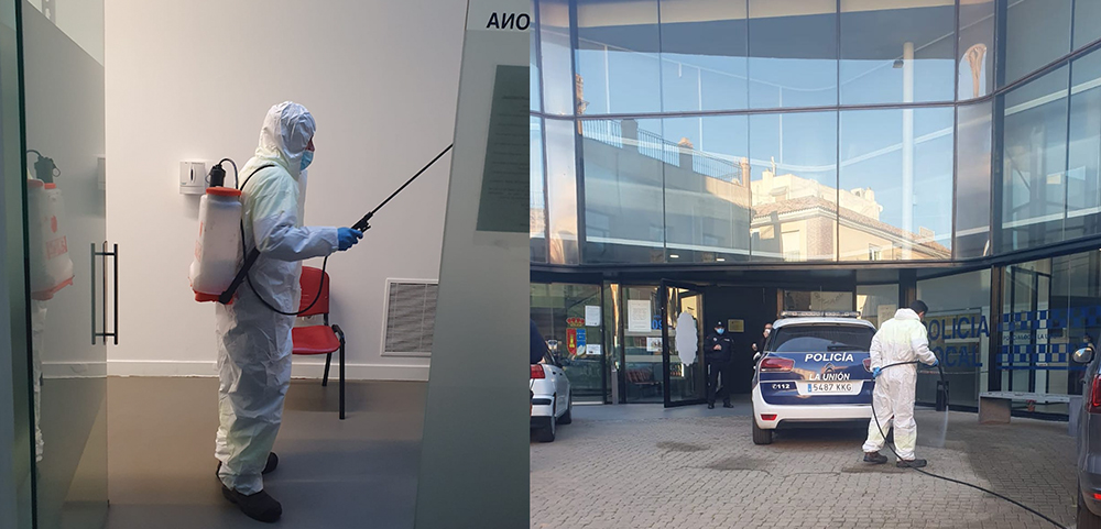 Los trabajos de desinfección que la Unión de Servicios Municipales está acometiendo por el municipio también han alcanzado a las instalaciones de la comisaría de la Policía Local de La Unión.