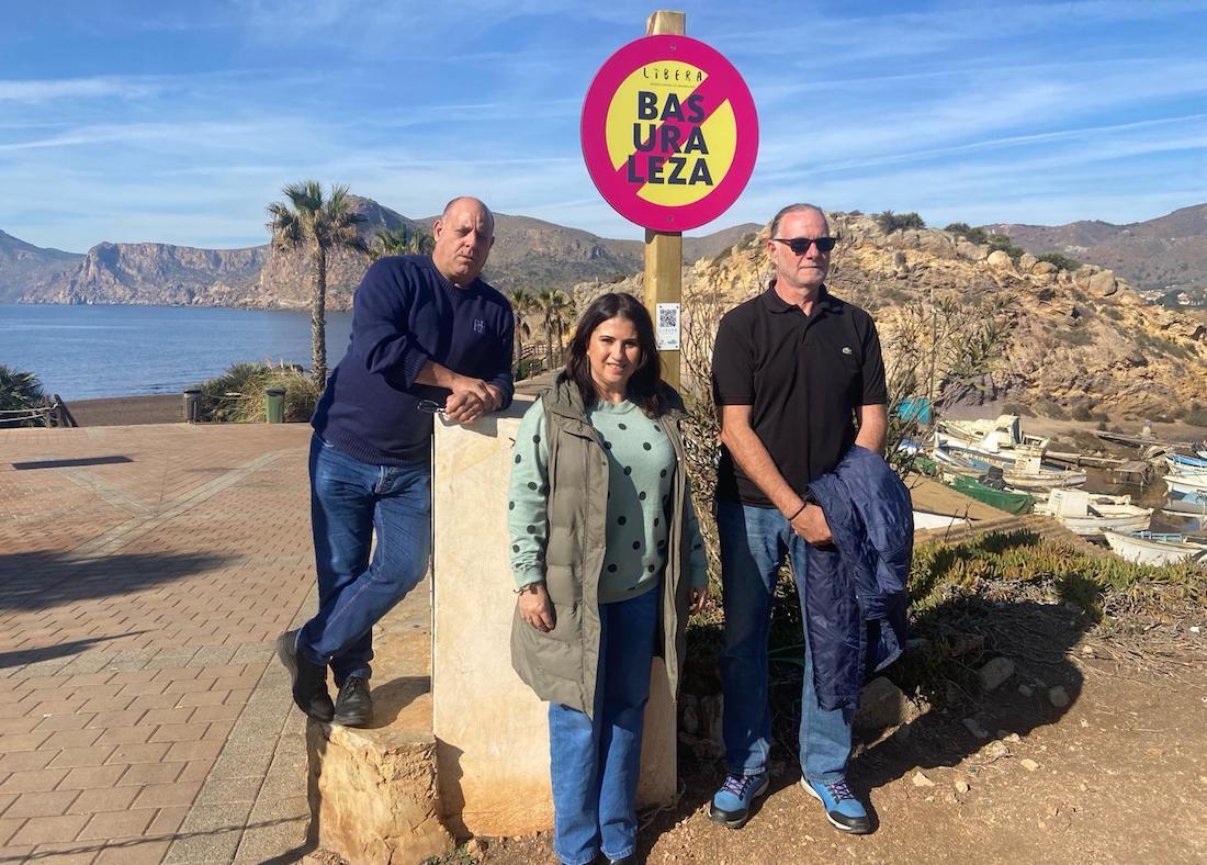 Isabel Egea Navarro y Damian García Martínez, concejales de Vox de La Unión, han elegido la playa portmanera de El Lastre para colocar el cartel que representa la prohibición de depositar basura en la naturaleza, habiendo sido otorgado este distintivo por la Asociación Libera por tratarse de una zona libre de '#basuraleza'.
