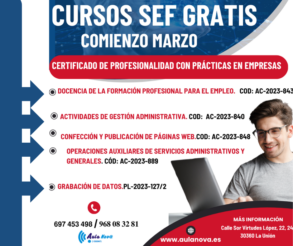 En marzo salen muchos cursos. Os dejamos un listado de los cursos gratuitos del SEF que empiezan el próximo mes en Aula Nova. ¿Estás buscando una forma de mejorar tus habilidades y destacarte en el mundo laboral? Comienza a prepararte para el futuro y aporta un valor añadido a tu currículum desde ahora. Nuestros cursos son la oportunidad perfecta para mejorar tus habilidades y ampliar tus conocimientos.