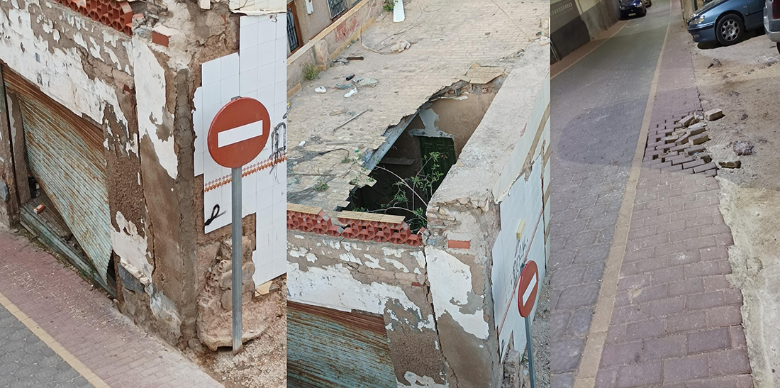 Un vecino se ha dirigido a nuestra 'Buzón de los lectores' para alertar de los riesgos que tienen pasar por dos puntos en una zona urbana muy céntrica de La Unión, en la calle Clavel, en concreto, donde se encuentran un inmueble en avanzado estado de degradación y un trozo de calle con las baldosas levantadas.