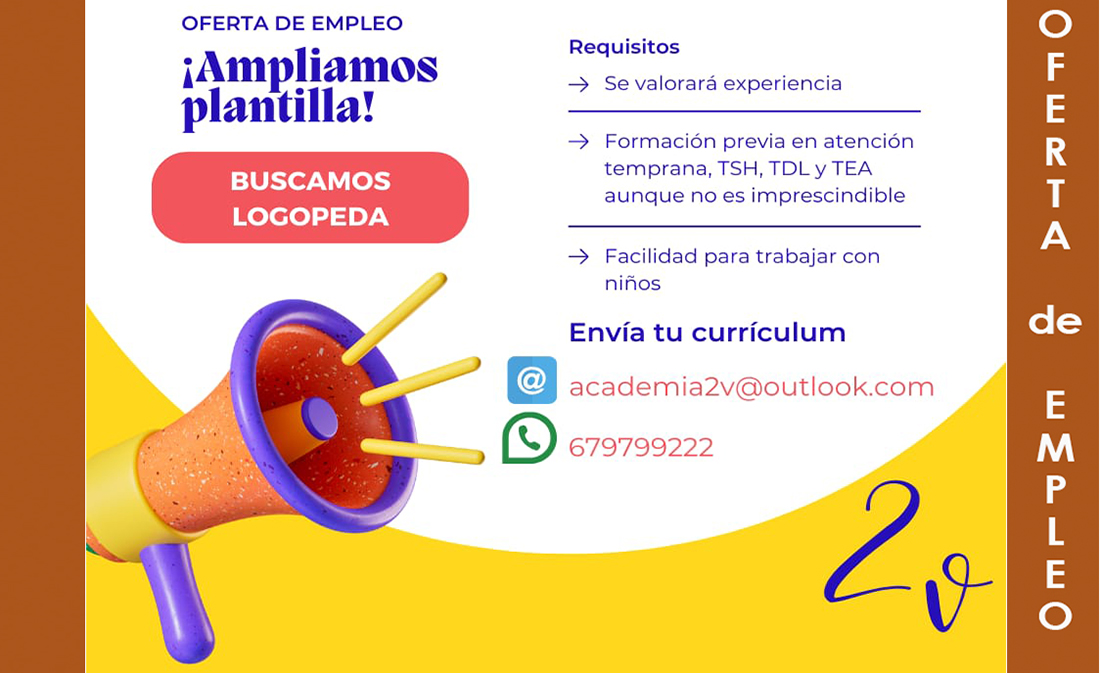 En Academia 2V ampliamos plantilla para cubrir un puesto de logopedia. Si estás interesado, envíanos tu currículo (CV) al correo electrónico Esta dirección de correo electrónico está siendo protegida contra los robots de spam. Necesita tener JavaScript habilitado para poder verlo. o al WhatsApp al 679 79 92 22