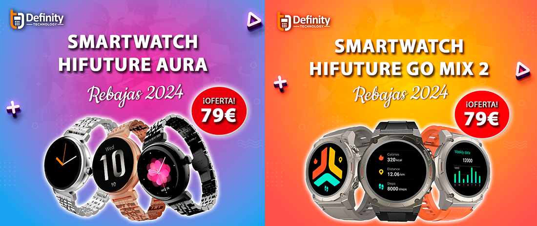 Por ese increíble importe, Definity Techonology te pone en promoción esta semana los mejores relojes digitales 'Smartwatch' en los modelos 'Hifuture Aura' y 'Hifuture Go Mix 2'. Estamos en wwwdefinitytech.es o en la tienda física de la calle Mayor de La Unión.