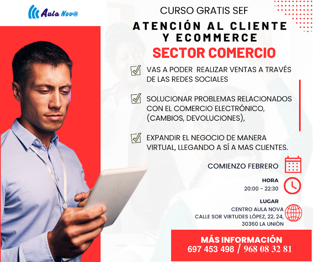 'Procedimientos básicos de atención al cliente y 'E-Commerce' será impartido por Aula Nova alternado con 'Atención al cliente en situaciones difíciles'. La duración total de ambos cursos es de 195 horas. Se desarrollará en horario de noche de 20 a 22.30 horas.
