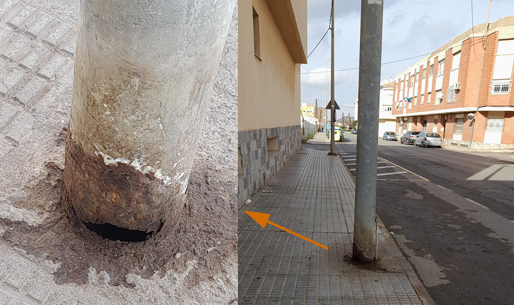 Un vecino se ha dirigido a nuestro 'Buzón de los lectores' para indicar que una farola de la calle Virgen del Carmen de La Unión "se cayó por su estado de corrosión en la base por la micción de los perros, estando actualmente el lugar está señalizado con conos. Ahora, también próximo, en la calle Carrera de Irún, otra farola puede tener el mismo destino, pues, como se observa en las fotos, está en muy avanzado estado de deterioro e, incluso, le falta un trozo", indica.